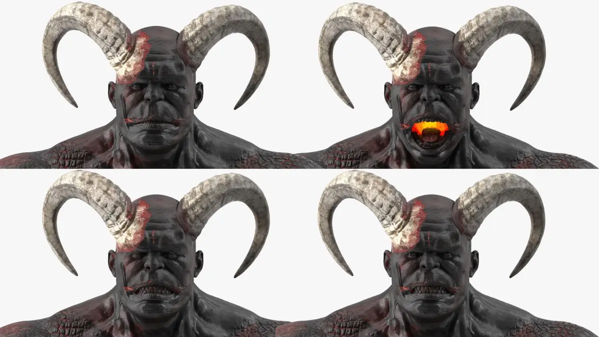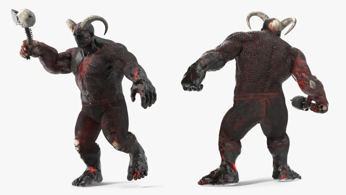 Demon Character with Hellish Hatchet Rigged is a 3d model of a fearsome demon-like creature, resembling a mythical warrior with imposing horns and rugged features.