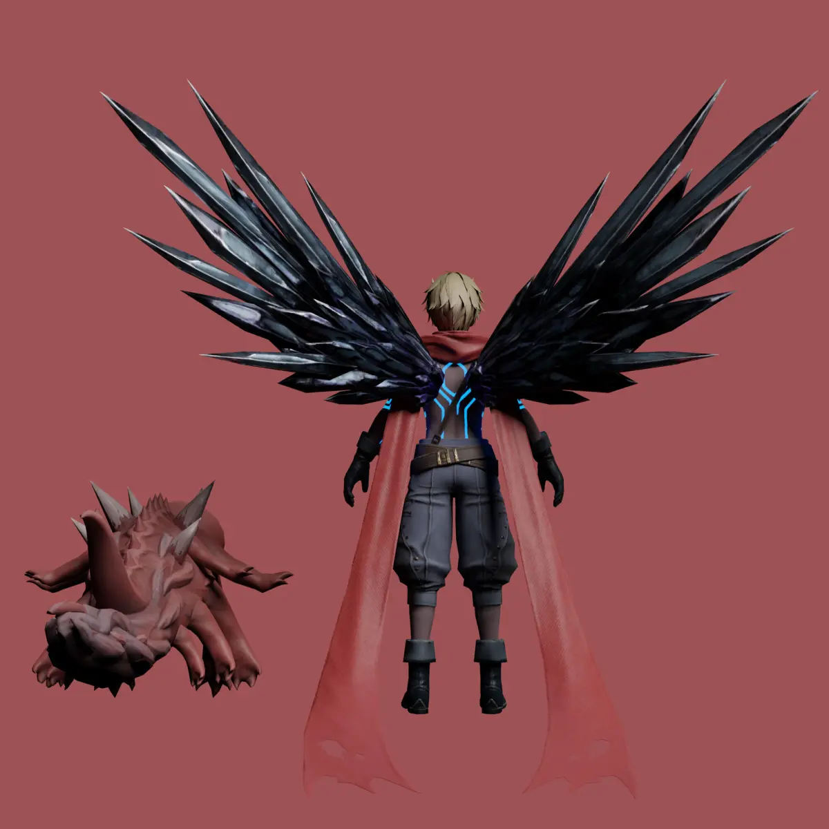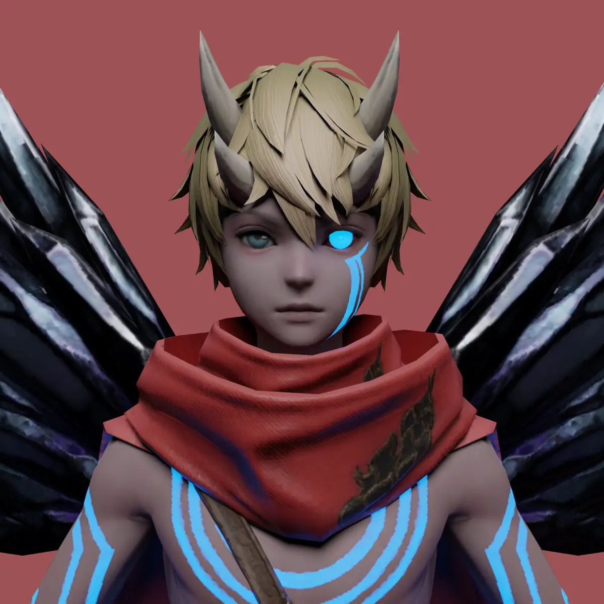 This stylized 3D character model depicts a youthful demon rebel with a striking and edgy appearance, perfect for fantasy or action-adventure settings. The character has a lean, athletic build with light purple skin and subtle muscular definition, suggesting agility and combat readiness. His short, tousled blond hair and small pointed horns give him a mischievous, otherworldly look, while a piercing gaze from glowing eyes adds a layer of intensity. He wears a distinctive red scarf and long cape, which flow dynamically to emphasize movement and heroism. His outfit blends rugged and modern elements: cuffed pants secured by a broad utility belt with detailed buckles and metal loops, fingerless gloves, and high leather boots. A diagonal strap across his chest adds both visual interest and practical design, hinting at gear or weapon storage. The combination of muted tones with bold accents—particularly the red scarf—makes the character visually compelling. This model is ideal for use in cel-shaded games, animated series, or stylized cinematics. Its clean topology and detailed textures support both real-time rendering.