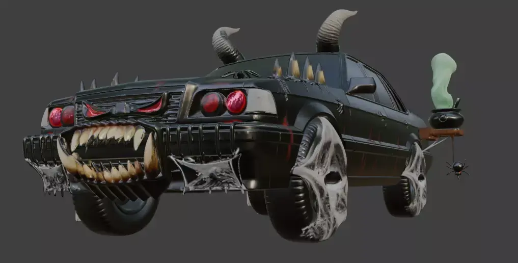 This 3D-rendered Demonic Halloween Car transforms a classic sedan into a nightmarish vehicle, featuring a menacing grille with sharp fangs, glowing red headlights, and twisted horns atop the roof. Spikes line the hood, while cobwebs and a spider dangle from the sides, and a cauldron with glowing green mist sits on the trunk. The tires are wrapped in tattered cloth, enhancing the spooky, otherworldly vibe perfect for a Halloween-themed 3D modeling.