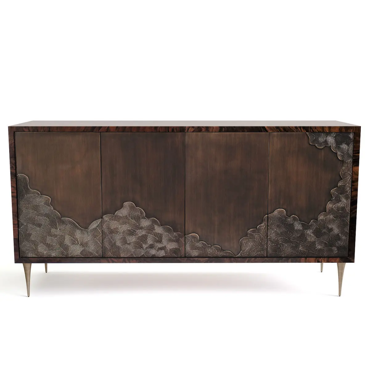 Hand-cast solid antique bronze door fronts and legsCarcass in matte Walnut BurlFour push-to-open doors with single interior shelfInterior finished in matte Cafe Oak