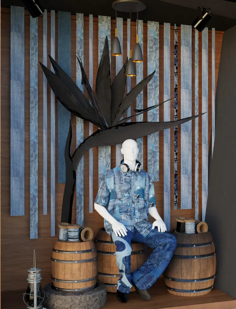 This highly detailed 3D mannequin sits confidently on wooden barrels, showcasing a fashionable and eco-friendly look. The model wears sustainable denim fabric, highlighting modern trends in sustainable fashion. The denim outfit, featuring a patchwork pattern, exudes style while promoting eco-conscious materials. The 3D model can be seamlessly integrated into your retail store’s window display or interior setup, elevating your brand’s aesthetic appeal. Perfect for boosting customer engagement and increasing the visual flow within your retail environment. This versatile model will not only attract attention but also highlight your commitment to sustainability and style.