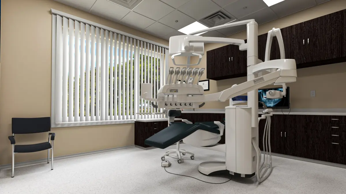 This model features a dental chair with an adjustable arm for dental tools, a computer screen displaying an X-ray, and cabinets for storage. The space is designed with functionality and hygiene in mind, featuring easy-to-clean surfaces and ergonomically arranged equipment to optimize patient care.