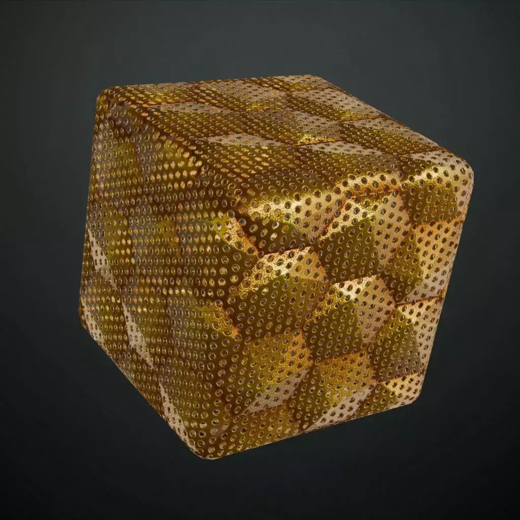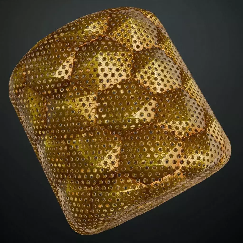 This is a PBR Texture Pack of Dented Hexagonal Gold Grill Metal. All the Maps such as BaseColor / Normal / Roughness / Height / Metallic / Opacity are provided as per requirement.