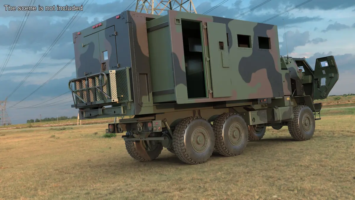 This model depicts a rugged truck equipped with advanced features for battlefield conditions. It includes a camouflaged exterior and robust chassis designed to withstand rough terrain. The vehicle is suitable for transporting equipment and personnel, integrating communication and support systems for effective mission operations.