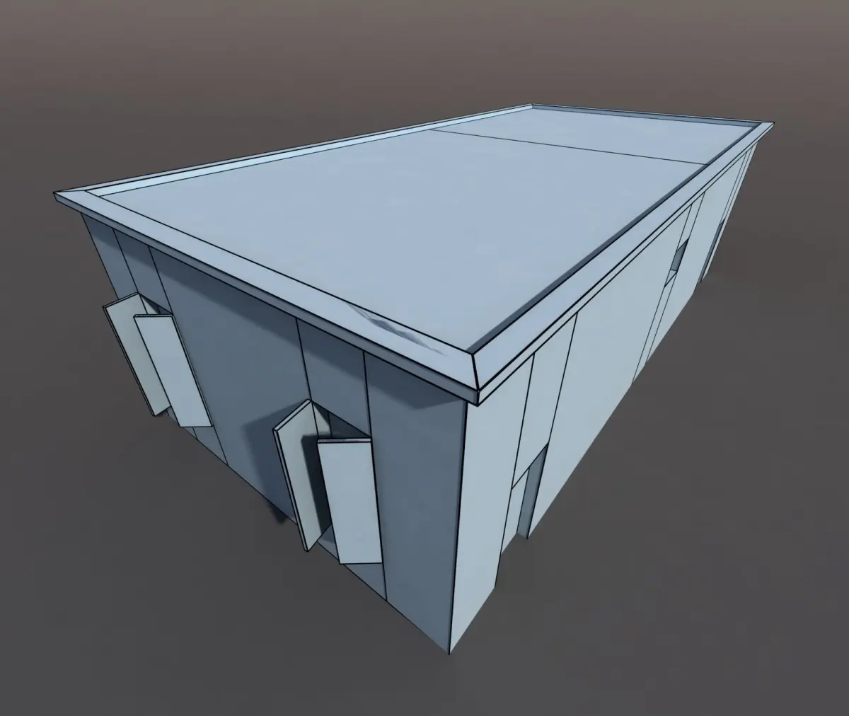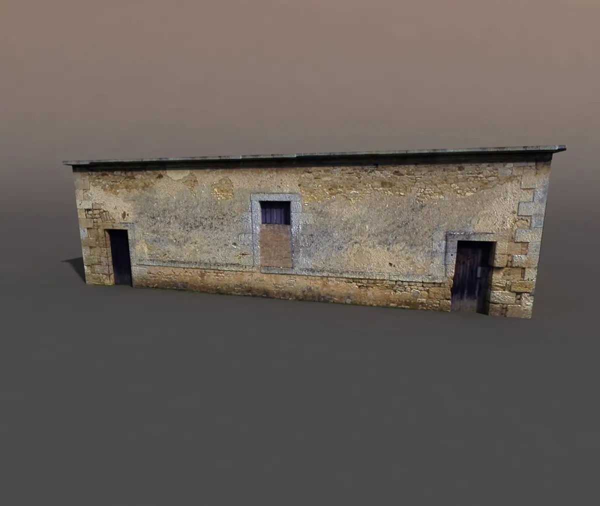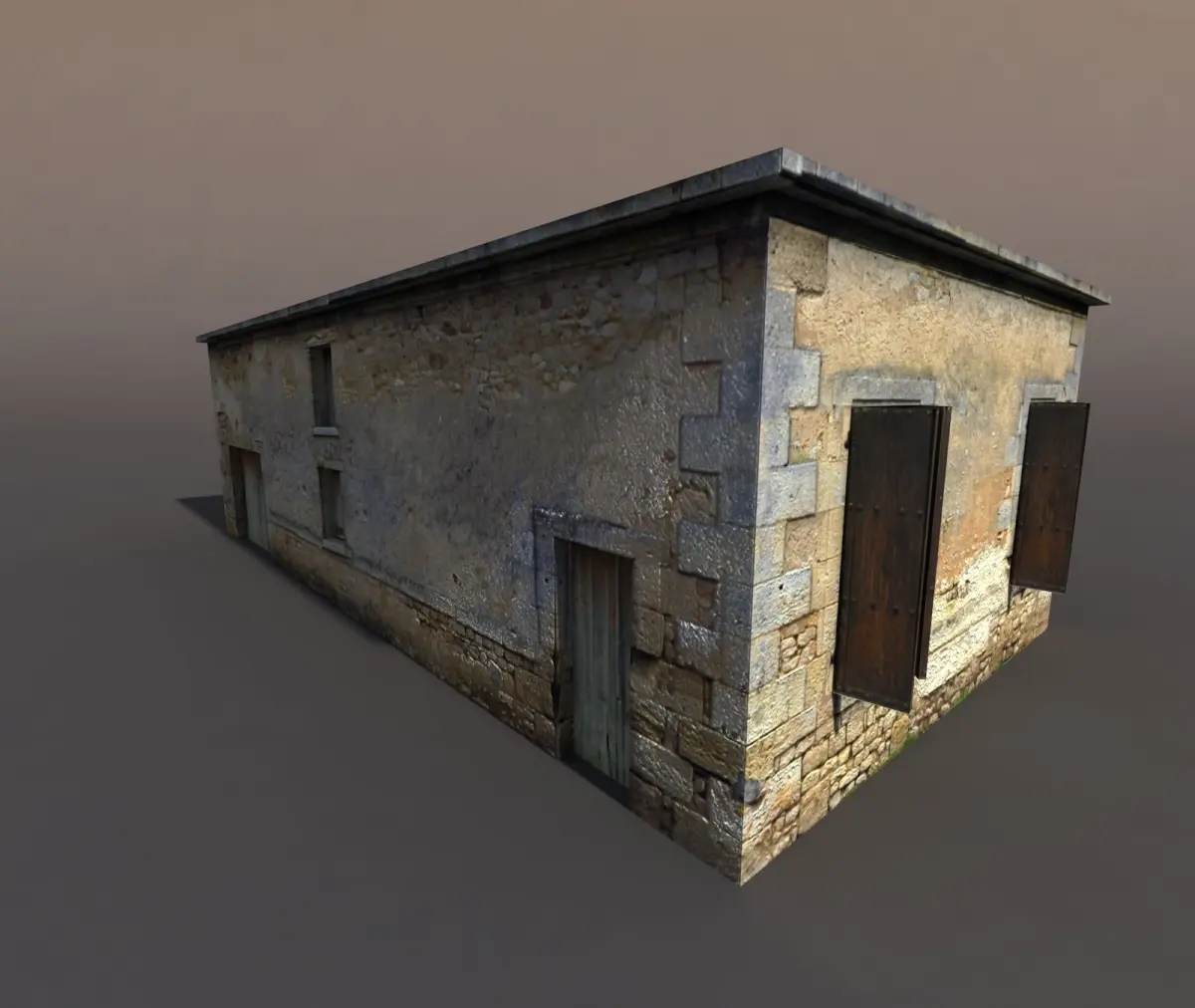 A 3D model of a low poly derelict building. Exterior only, no interior.