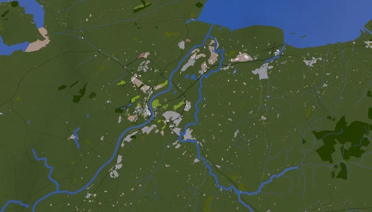 3D representation of Derry Londonderry City of Ireland using 2019 map data. Roads, railway, land, water, buildings are made using real world data. Buildings are accurately placed and resembles the real world object up to some extend. Please note that random buildings (varying height) are added to those area where real world data is not available.