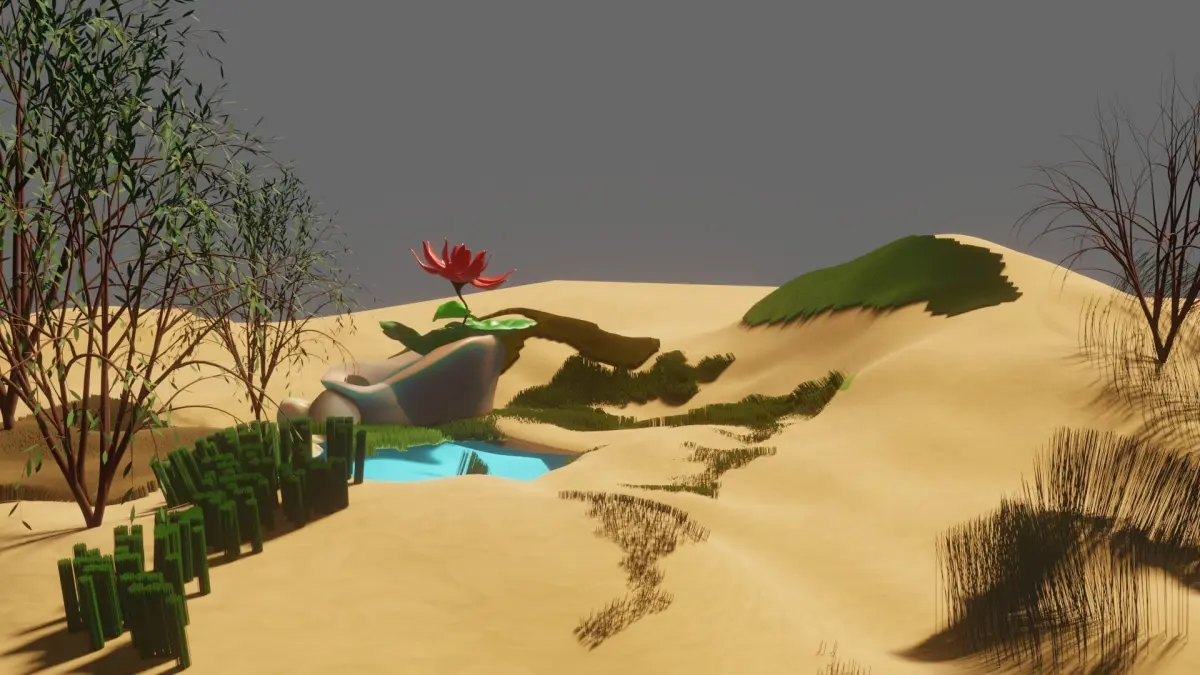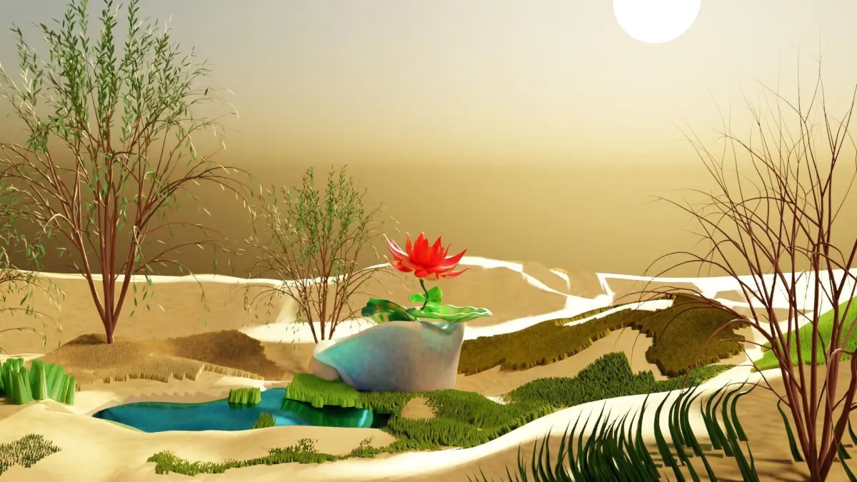 Blender Artistry: Desert and Lotus Short Animation showcases the exquisite capabilities of Blender software. It masterfully reimagines a desert setting and brings to life a serene lotus pond, inviting viewers into an awe-inspiring realm of natural beauty.