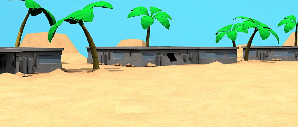 The scene uses PBR textures for the buildings and the sand, each texture is 2k.
