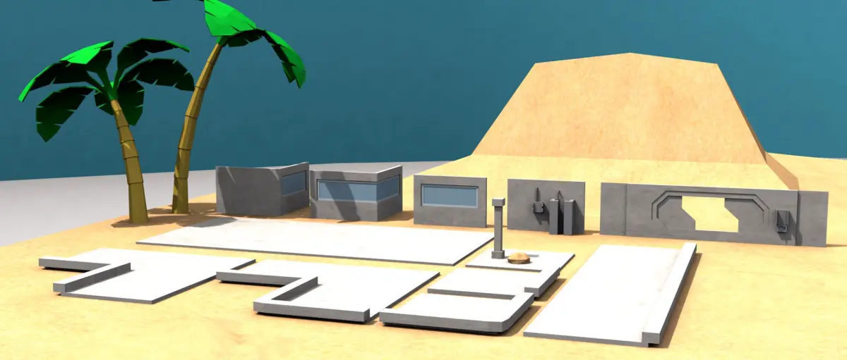 Everything in this desert scene can be constructed to the way you like it. The height of the building walls are around 200 cm. The whole design is built to real world size.Each modular asset is built to snap accurately to each other to give you a perfect tight fitting. The models were created in Autodesk 3DS Max 8 and the render is done with the scanline render.