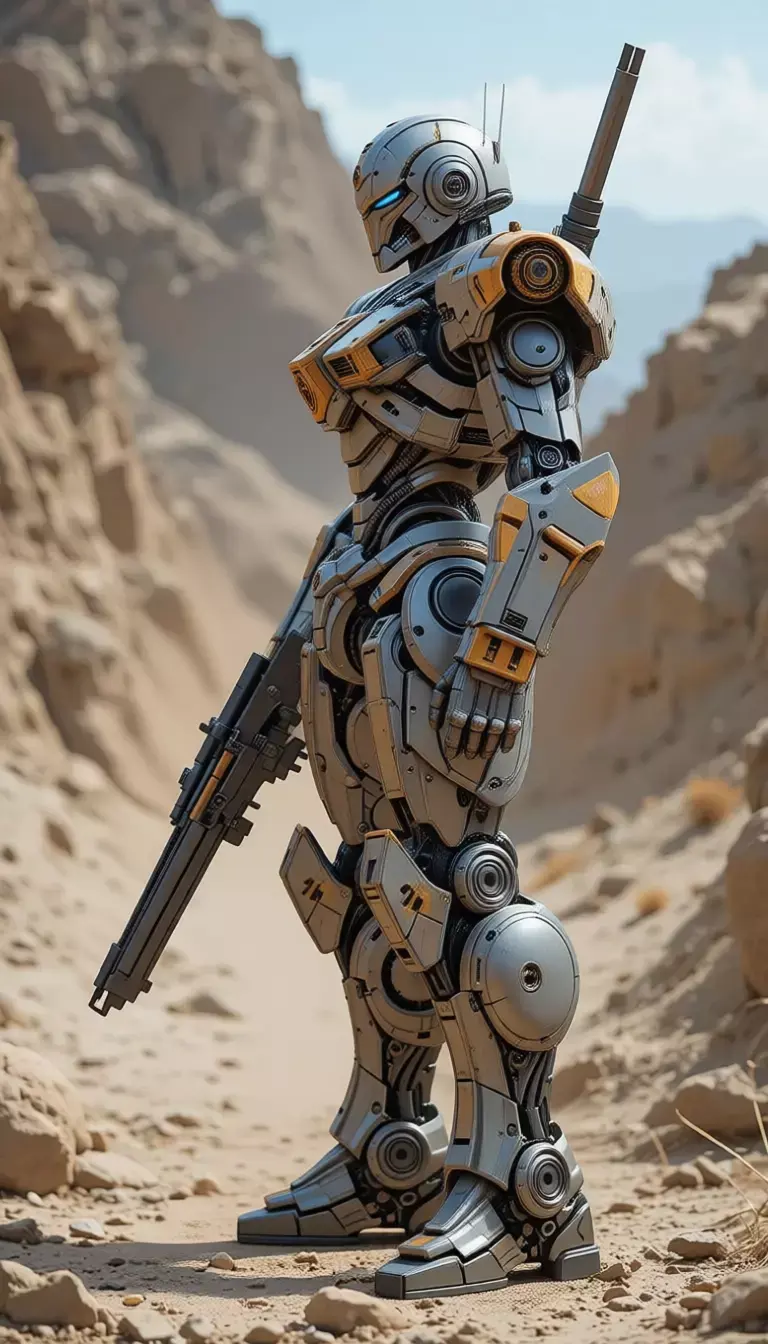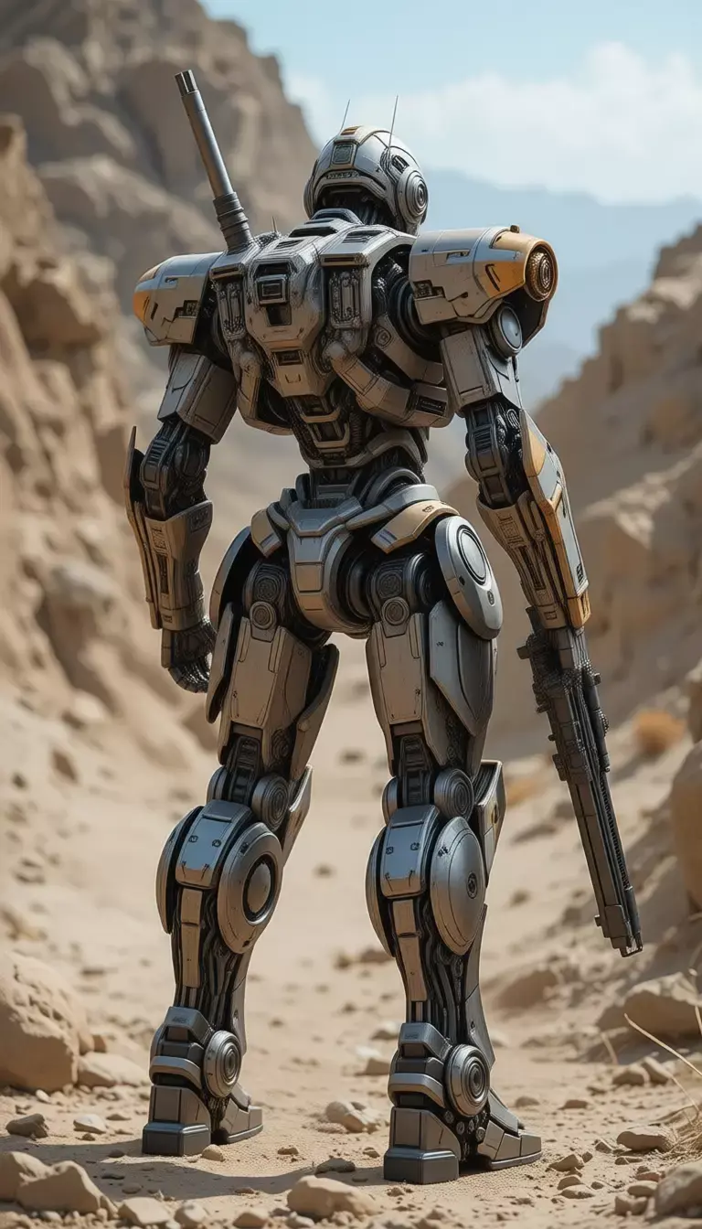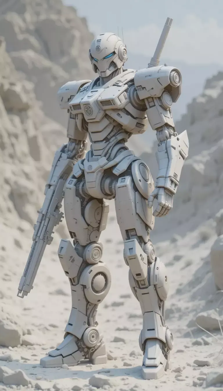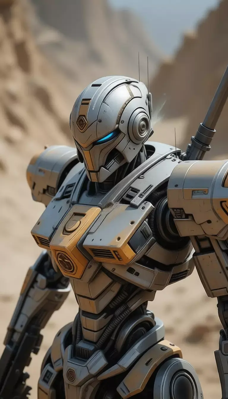 Search terms: desert battle mech 3d, sci-fi war machine, glowing eyes robot, high end character render, editorial sci-fi 3d, cinematic robot, premium 3d asset, game design, symbol of power robot, luxury brand content, digital fashion, tech product shot, robotic motif jewelry, elegant mech 3d, sculptural robot, advanced technology, powerful accessory, cinematic design, fantasy architecture, exotic design.