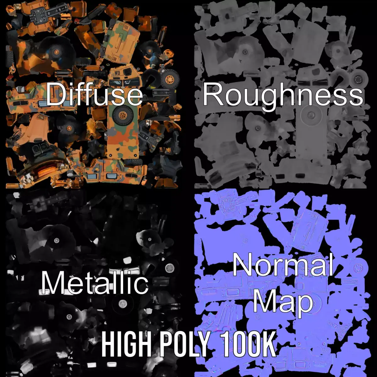This Desert Camo Armored Vehicle model pack is ideal for military simulations and realistic game environments, showcasing intricately detailed textures. The model is designed with three levels of detail: low-poly for mobile devices, middle-poly for environment settings, and high-poly for high-end renderings. It is perfect for use in production rendering with software such as 3ds Max, Maya, Cinema4D, and Blender, as well as game engines like Unity and Unreal. Each model features PBR textures, Diffuse, NormalMap, and reflection/roughness/metallic, optimized for modern rendering engines. All models are accurately unwrapped with no overlapping UVs. The textures are 4096*4096 in size. If you enjoy this model, please like and leave a comment!
