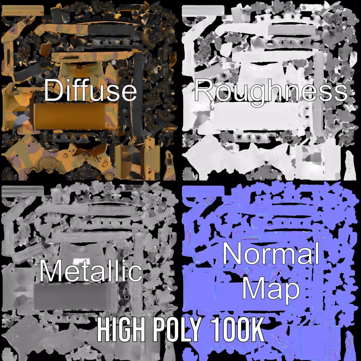 This detailed Desert Camouflage Tank model pack features a robust and realistic military vehicle design, ideal for use in game development, simulation, and educational platforms. Each model has 3 levels of detail: low-poly(1000 triangles for mobile), middle-poly(10 000 triangles for environment), and high-poly(100 000 triangles), which allows for the use of this model in production rendering(such as 3ds max, Maya, Cinema4d, Blender, Vray/Corona/Cycles and all other), game engines(Unity and Unreal compatible), and interactive presentations, providing a choice of detail based on the LOD System principle. Perfect for scenarios involving desert warfare simulations, strategy games, or military history projects. The model's textures are PBR, Diffuse, NormalMap, and reflection/roughness/metallic, which are suitable for any modern rendering engine. All models accurately unwrapped and have no overlapping UV. All textures are 4096*4096 in size. If you like this model, please leave a like and comment.