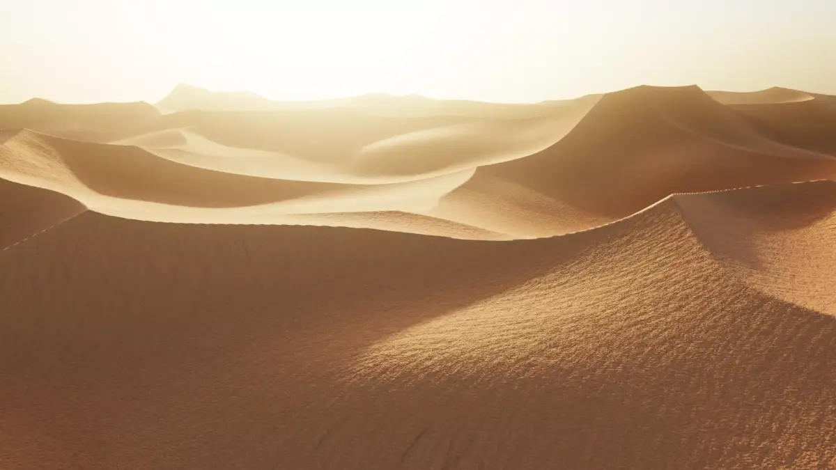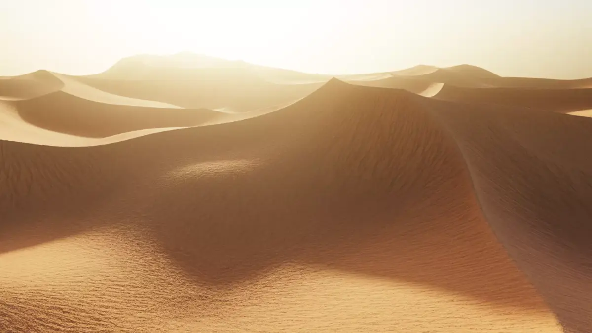 A sand landscape terrain defined by sharper dune crests and more pronounced surface variation, with consistent topographical variety across the environment. The terrain emphasizes clearer ridge outlines and stronger directional flow, resulting in a surface that reads with more contrast and structure. The consistent distribution of dunes creates a cohesive landscape base, while high-resolution 8K textures support detailed material response in both wide views and closer shots.