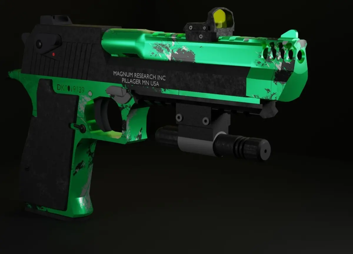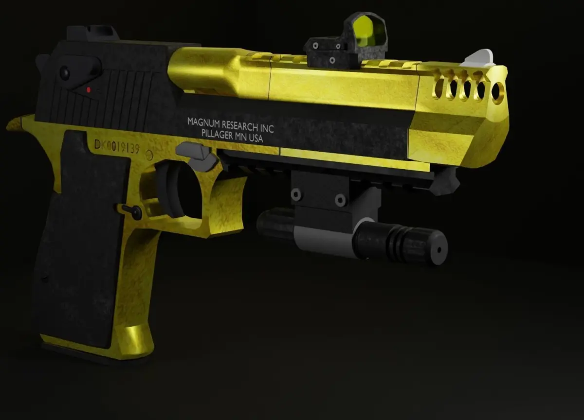 name obj : Desert eagle magnum researchtipe : pistol weaponlow poly ready for gamesattachment : red dot , lazer magzin , bullettexture(skins) : gold , selver , green , black military.