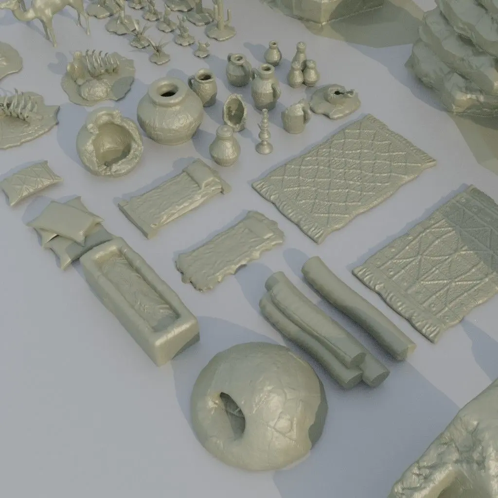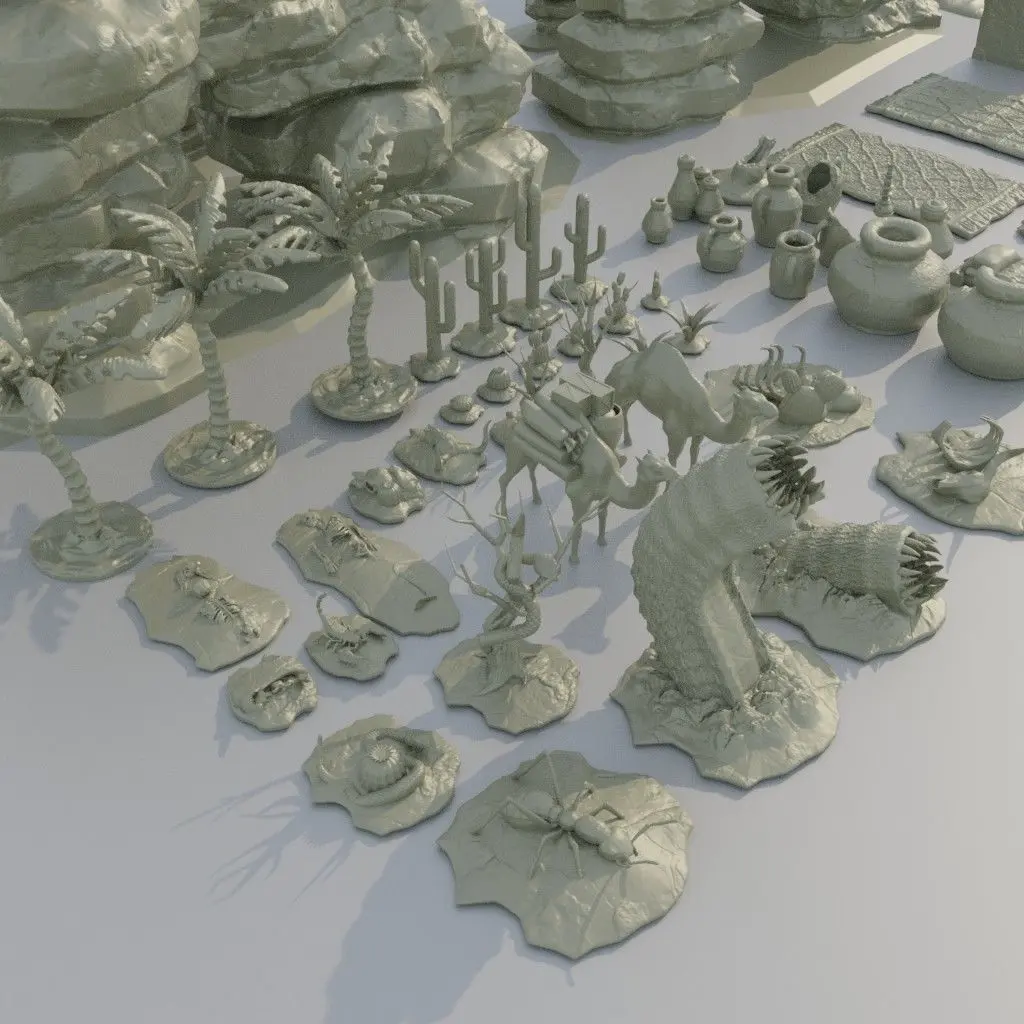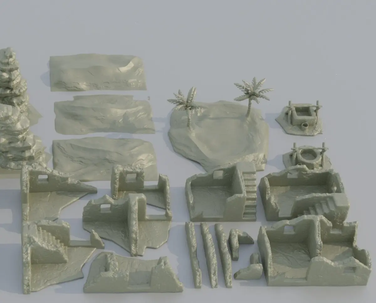 Desert Environment Pack Adjusted to 28 mm miniatures Inside can be playable FDM Print preferred (Gray good ) No need to slice adjusted to Ender 3 pro v2 standarts