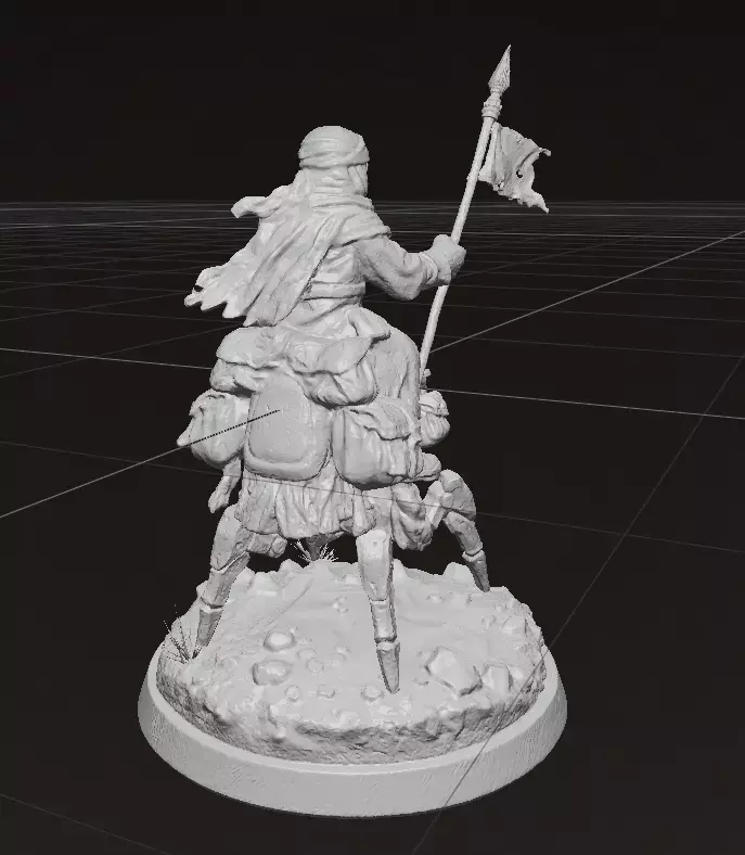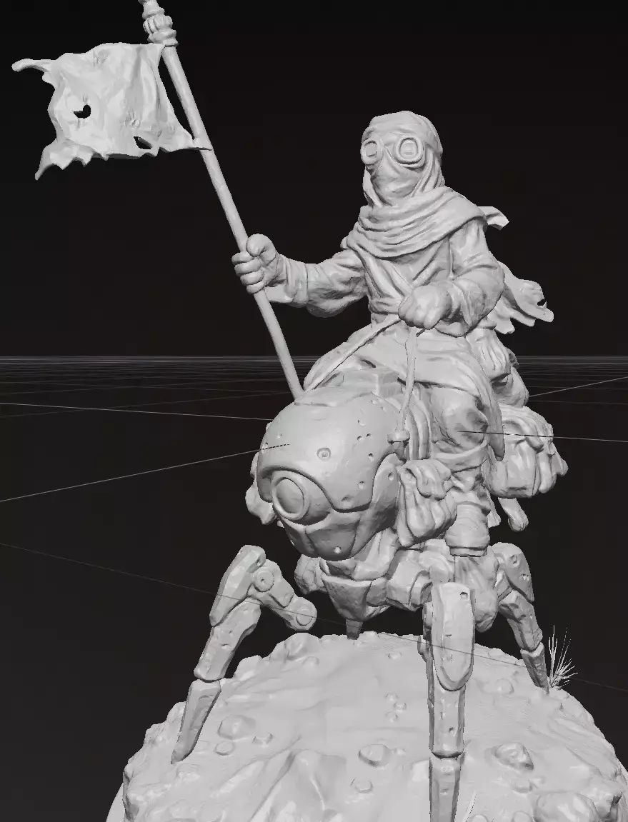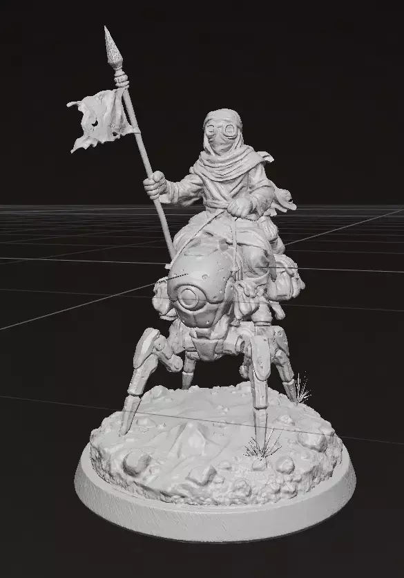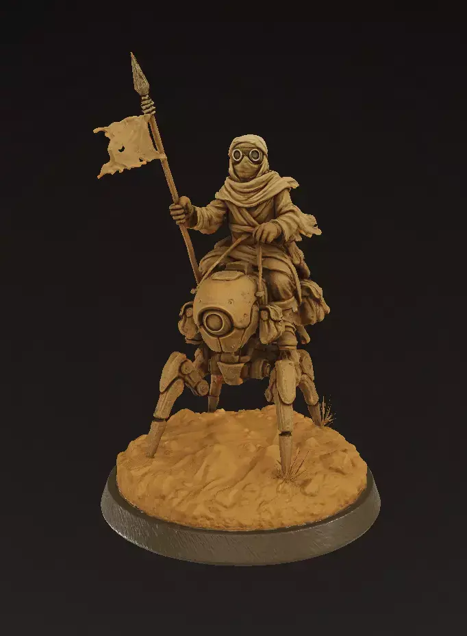 A lone desert wanderer, cloaked in sand-colored robes and goggles, rides a four-legged mechanical mount across an arid landscape. The fusion of ancient survival garb and advanced robotics captures a striking post-apocalyptic aesthetic — a symbol of resilience, adaptability, and the blending of tradition with technology.