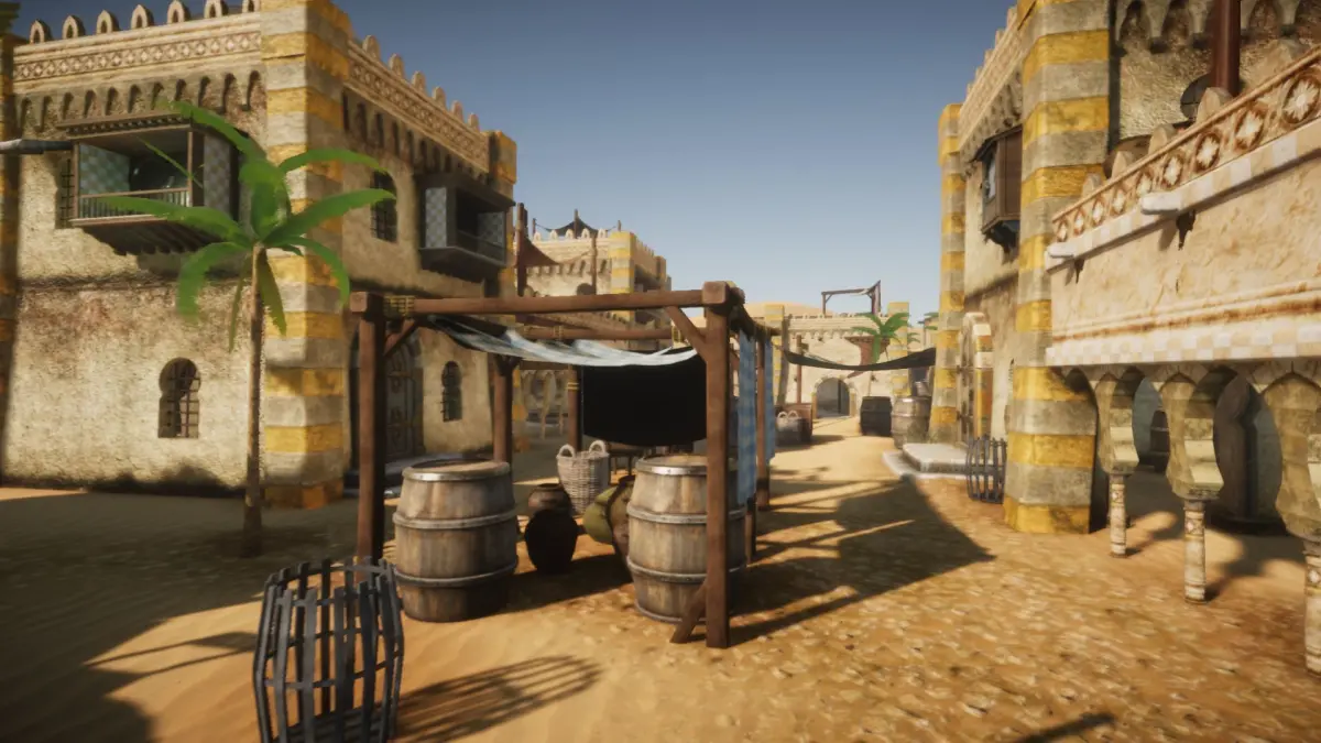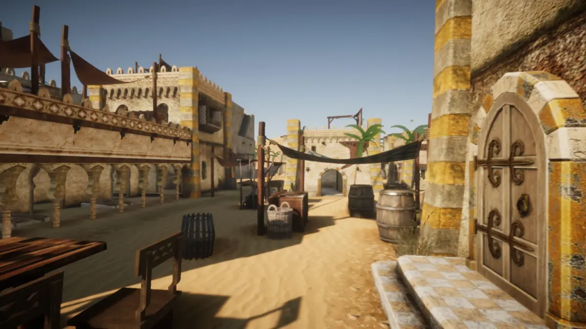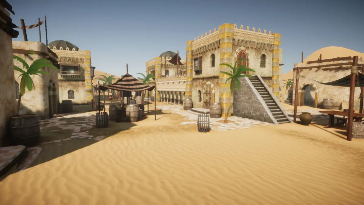 The pack includes over 50 models, including 5 desert houses and additional decorative props like canopies, balconies, pots, barrels, palms and others. Some of the houses have both interior and exterior, some only exterior.