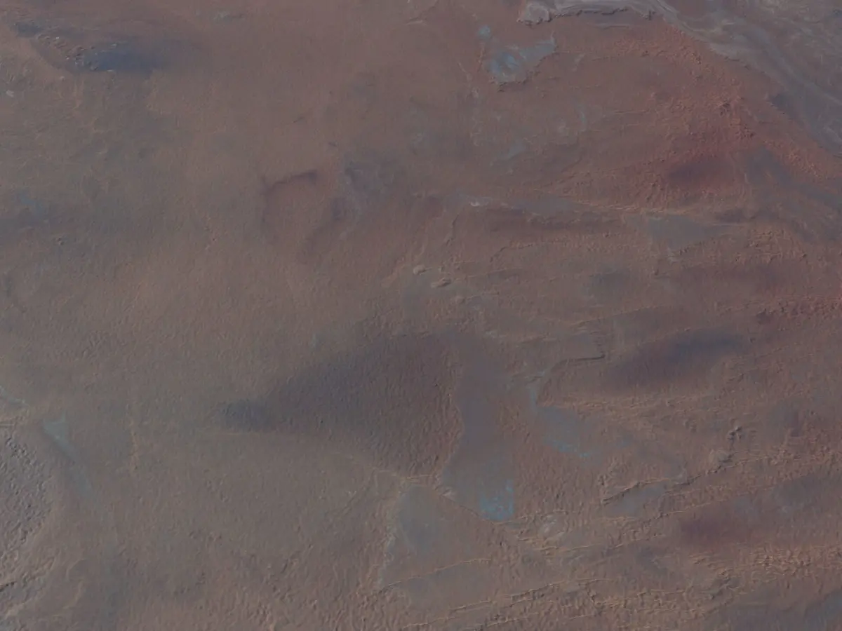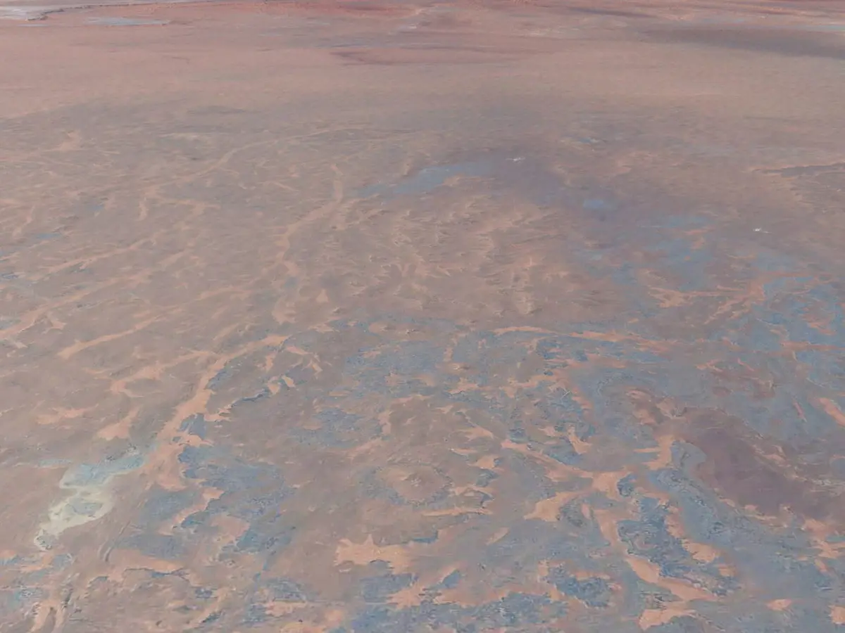 A 3D MODEL SCENE OF A DESERT PLAINS LANDSCAPE, AERIAL VIEW: