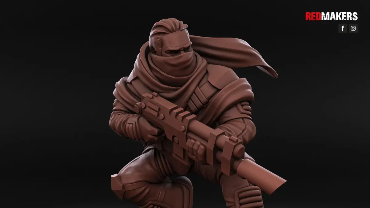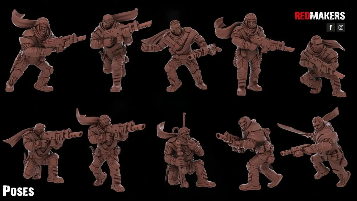 The infantry squad of the Desert Raiders consists of 8 soldiers, a radio operator and a sergeant. Each warrior has several weapon options. Scaled for 28 mm tabletop.