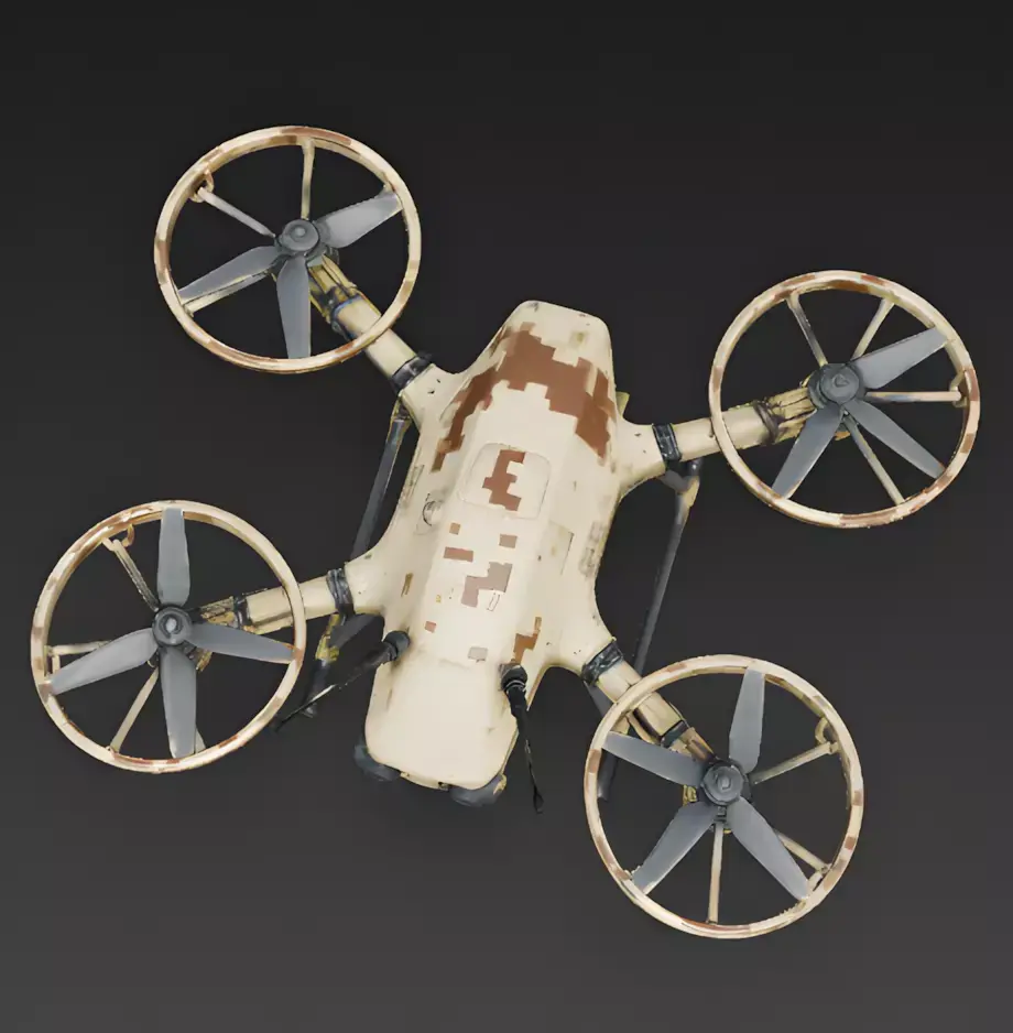 The Overall Concept This asset represents a high-tech tactical quadcopter designed for desert surveillance and reconnaissance. It balances a sleek, modern aerodynamic shape with rugged military hardware, making it a perfect fit for modern warfare or sci-fi game environments.