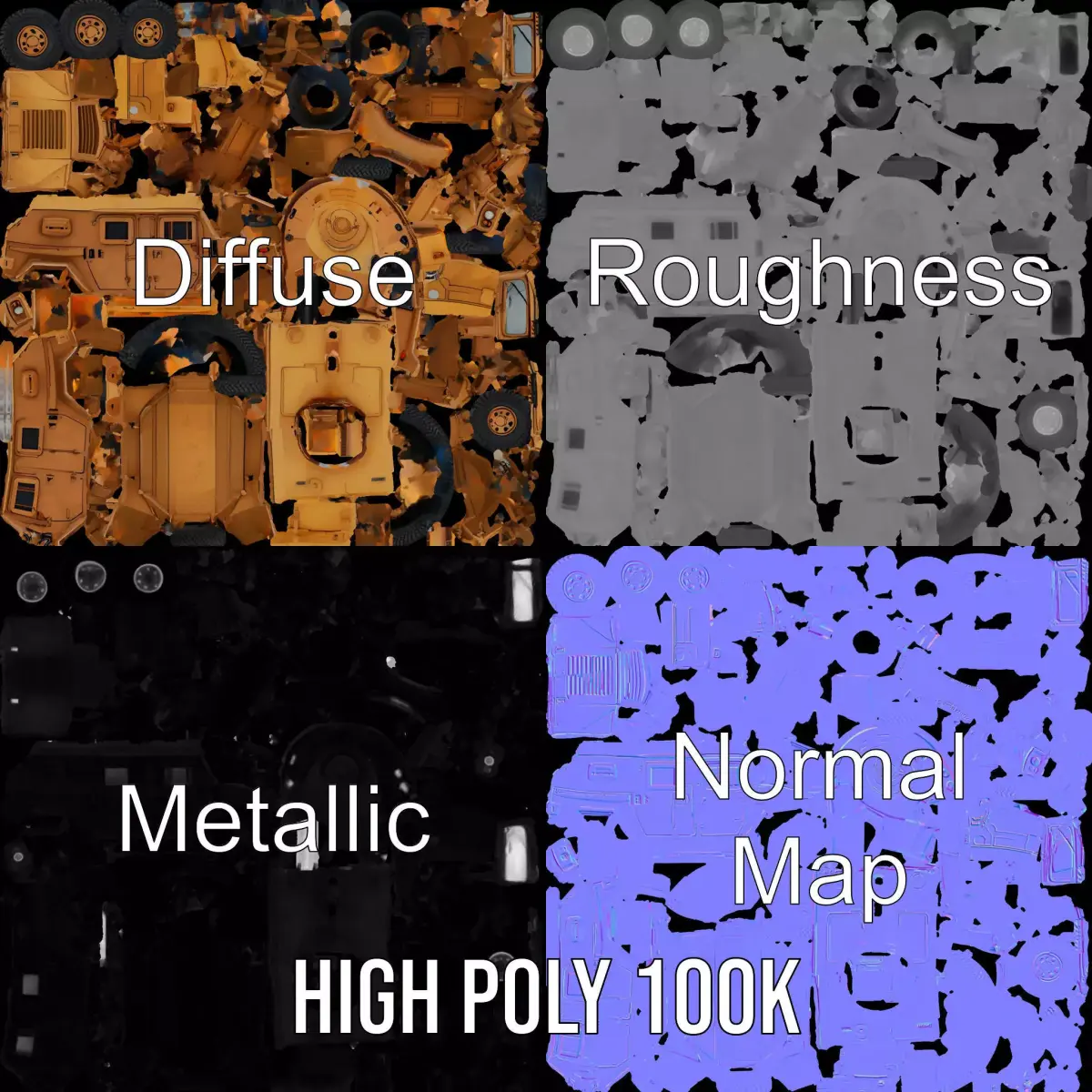This Desert Tactical Vehicle model pack offers a highly detailed, modern military vehicle with realistic textures and design. Perfectly suited for action scenes, military simulations, or as background elements in urban environments, the model provides versatility and realism. Each model has 3 levels of detail: low-poly (1000 triangles for mobile), middle-poly (10,000 triangles for environment), and high-poly (100,000 triangles), which allows for the use of this model in production rendering (such as 3ds Max, Maya, Cinema4D, Blender, Vray/Corona/Cycles and all others), game engines (Unity and Unreal compatible), and interactive presentations, providing a choice of detail based on the LOD System principle. The model's textures are PBR, Diffuse, NormalMap, and reflection/roughness/metallic, suitable for any modern rendering engine. All models are accurately unwrapped with no overlapping UVs. Textures are 4096*4096 in size. If you like this model, please give it a like and leave a comment!