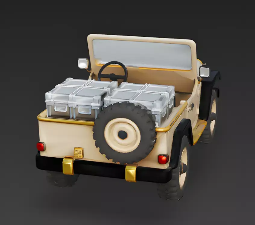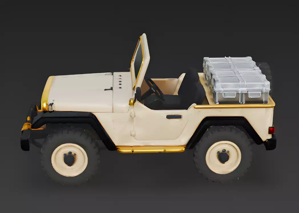 Open-Air Scout DesignFollowing a classic recon silhouette, the jeep features an open-top design with a simple gold-framed windshield and black leather seats. This low-profile look is optimized for maximum visibility, making it easy to see character models sitting inside the vehicle.