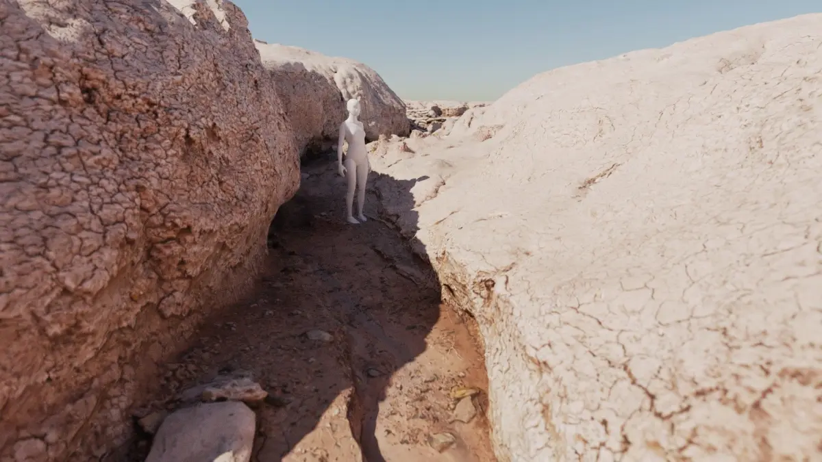 This is high detailed photogrammetry reconstruction (3D Scan) of large 16 by 8 meter ravine wash ground by a highway in Bombay Beach, California in Sonoran Desert