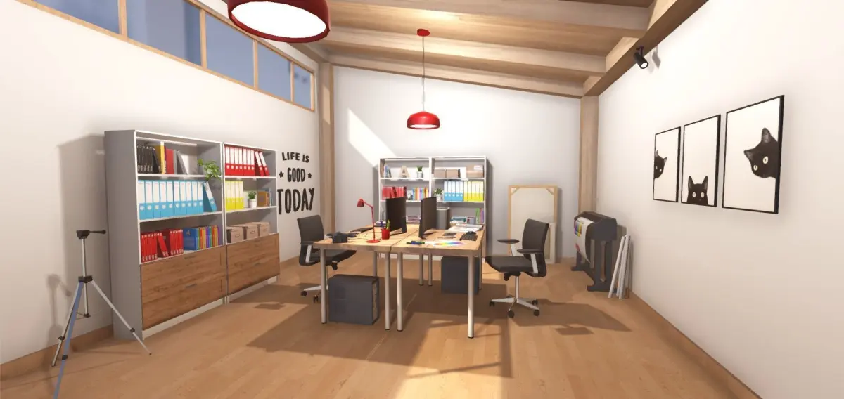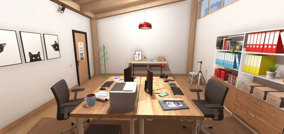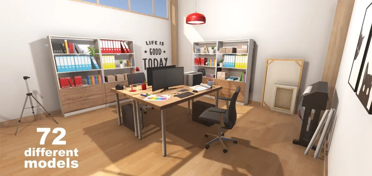 Interior of a design studio with a young and modern style originally created for Unity. There are 72 models completely different: furniture like two types of desks, office chairs and cupboards for books and folders. There are also different office and decorative objects, plants and devices like a computer with its mouse, keyboard and hard disk. There is also a printer, a plotter, a hanger, pictures and many other objects. All the models are low-poly to be used in games and applications. There are also the FBX models included separately, textures included, to be used in other 3D apps.
