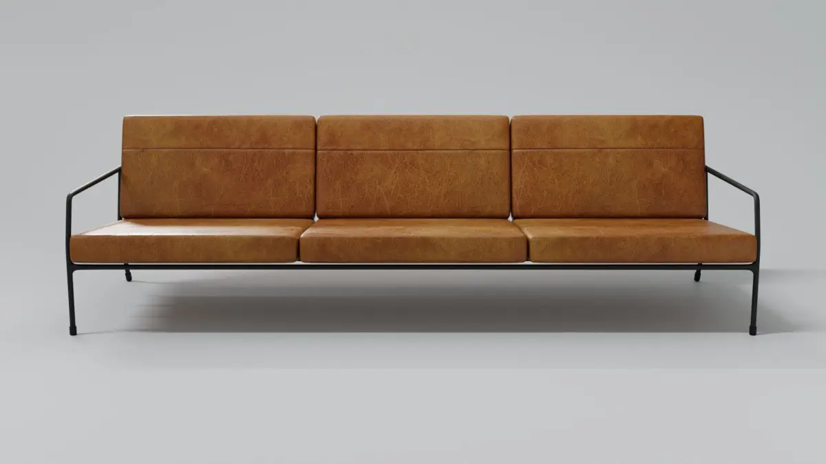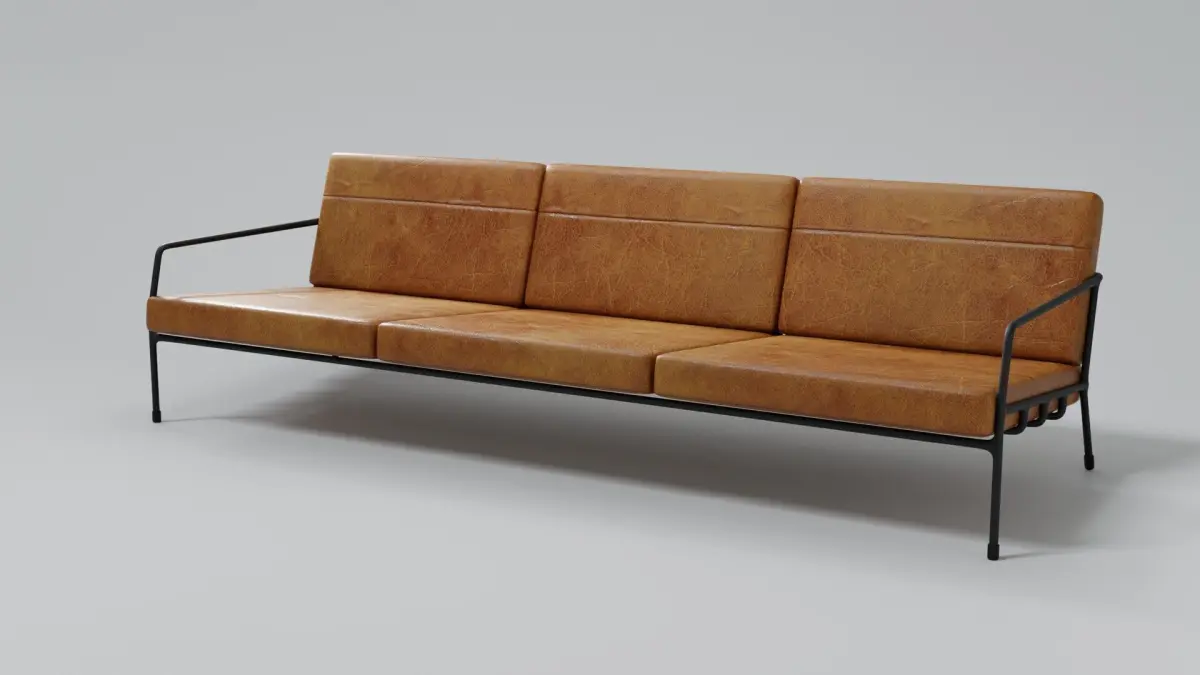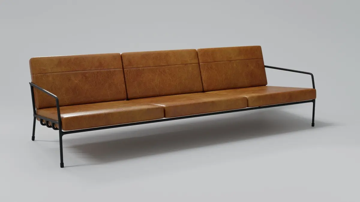 A 3D model of a three person sofa with a clean look. Remembers to the lean design of the seventies with a modern twist. Smooth leather seats on a thin metal frame. Powder coated rough look to compensate the shiny leather cushions.