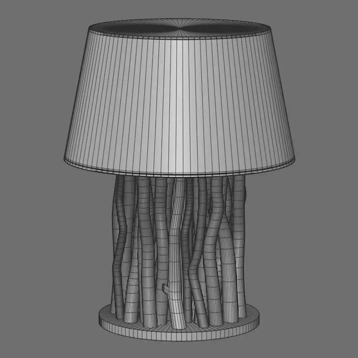 3D model of a designer table lamp with a natural wood texture and a fabric lampshade. The lamp features a realistic wooden base made of intertwined branches and a soft cylindrical shade, creating a cozy interior accent piece.