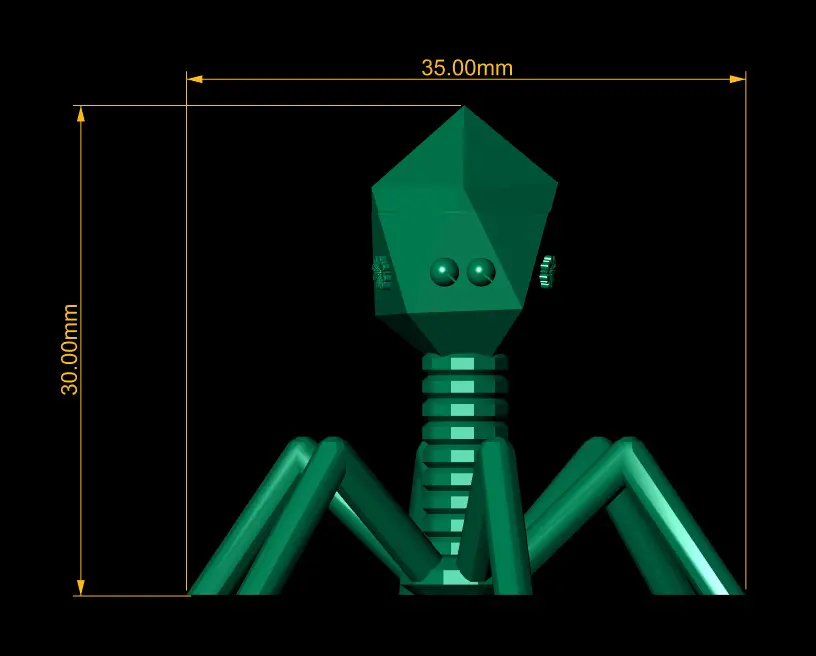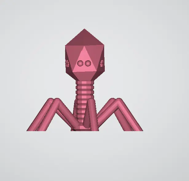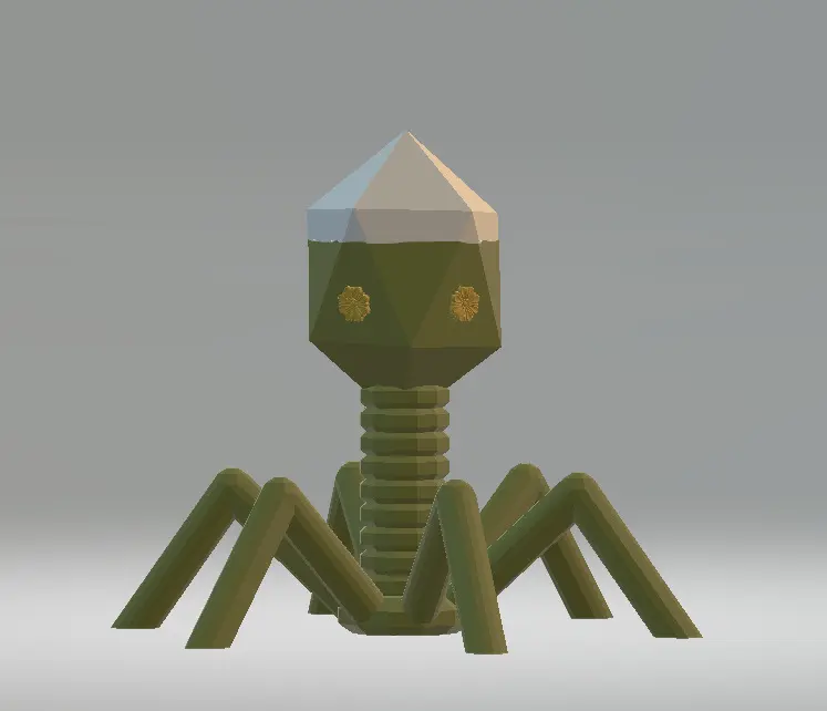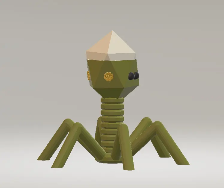 This is a stylized 3D model inspired by a bacteriophage virus, featuring a polygonal green body with a white diamond-shaped head. The model includes segmented tube-like structures representing the tail, and four articulated legs positioned symmetrically, giving it an insect-like appearance. The simplistic black circular eyes and small side appendages add a friendly, character-like touch, making it ideal for educational, scientific, or entertainment purposes such as games, animations, or medical illustrations.