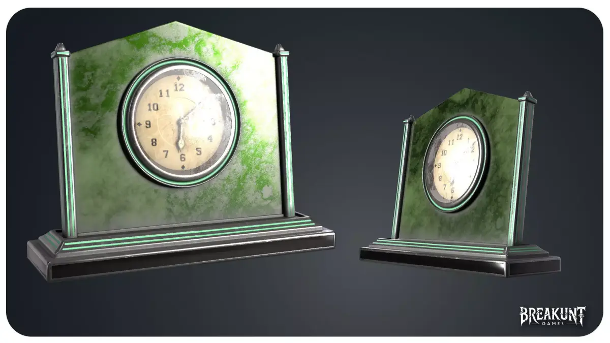 This realistic desk clock is inspired by early 1900s design and brings a strong antique feel to any scene. With its green marble-style body, aged clock face, worn glass, and subtle metal details, it has a classic look that feels both elegant and believable.