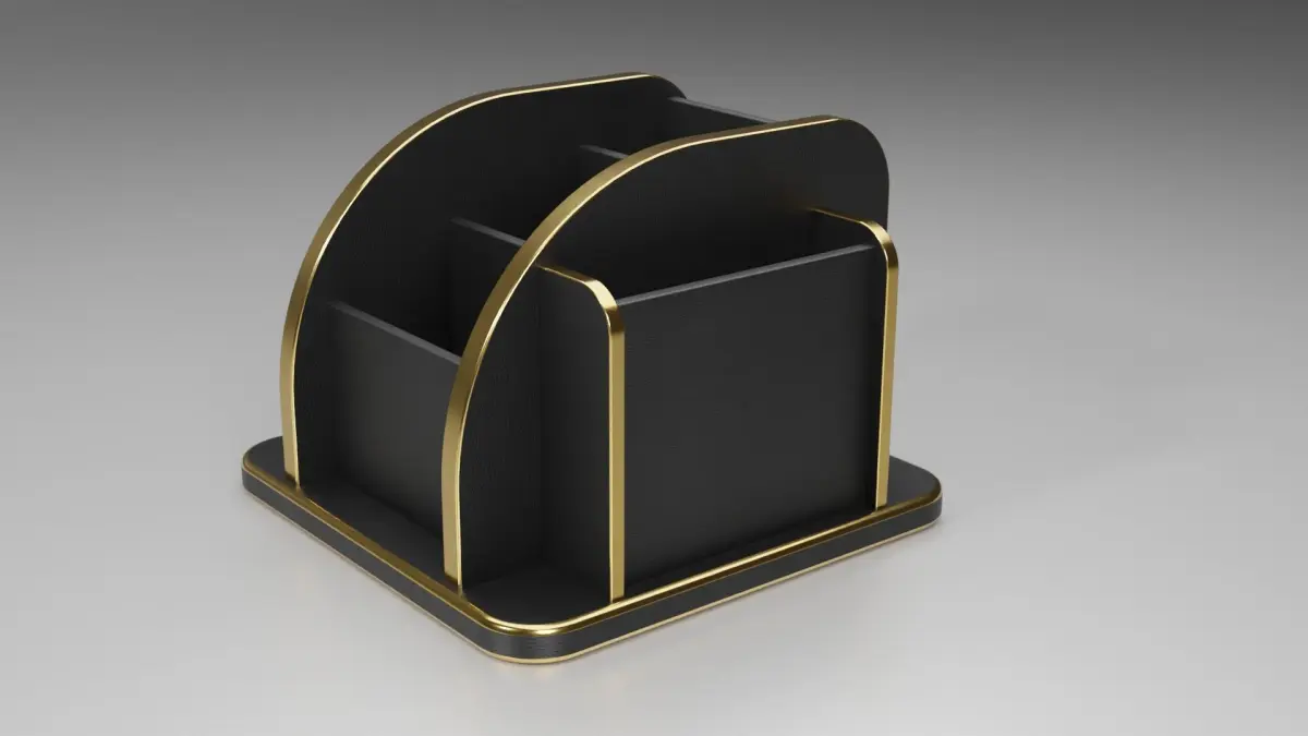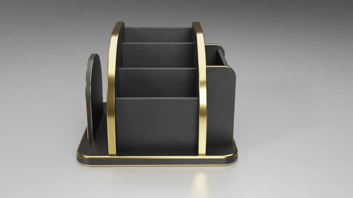 The desk organizer is a luxurious and elegant piece, designed to bring both style and functionality to any workspace. The base and compartments feature a sleek, leather-like texture that adds a touch of sophistication, while the gold accents along the edges give it a refined, premium look.