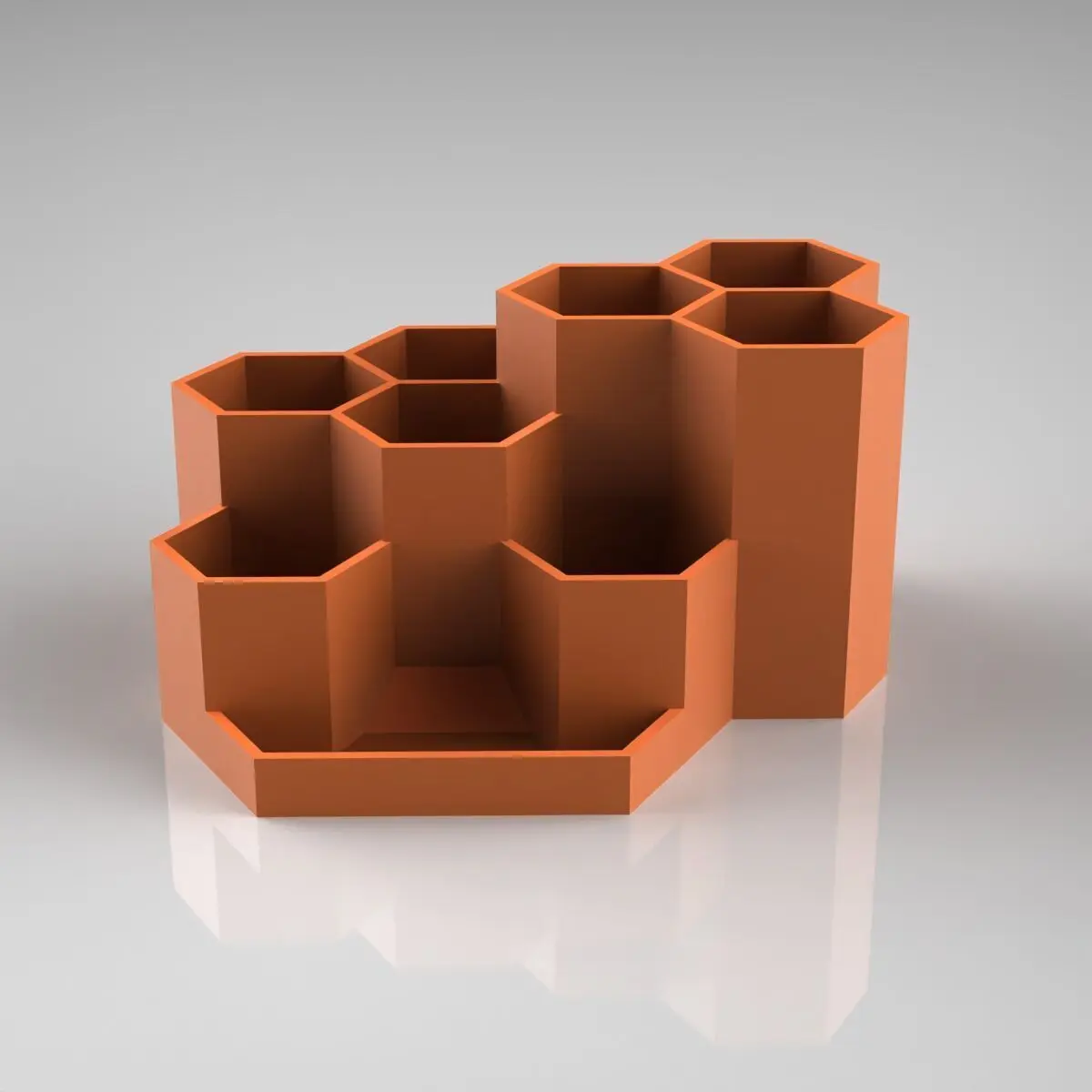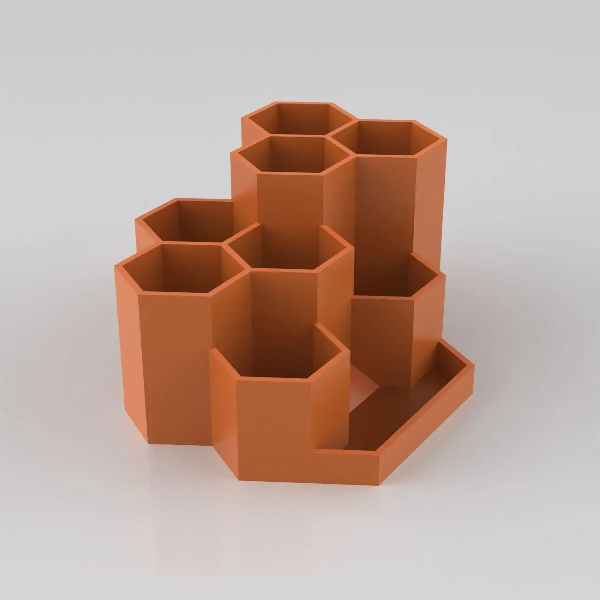 This desk organizer features a modern hexagonal design, providing aesthetic appeal and functionality. The arrangement of various compartments caters to organizing multiple stationery items seamlessly.