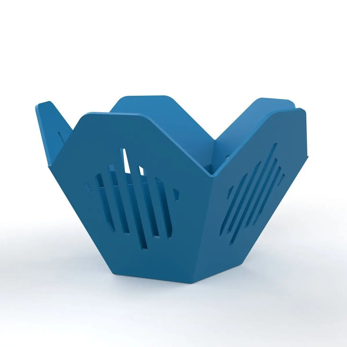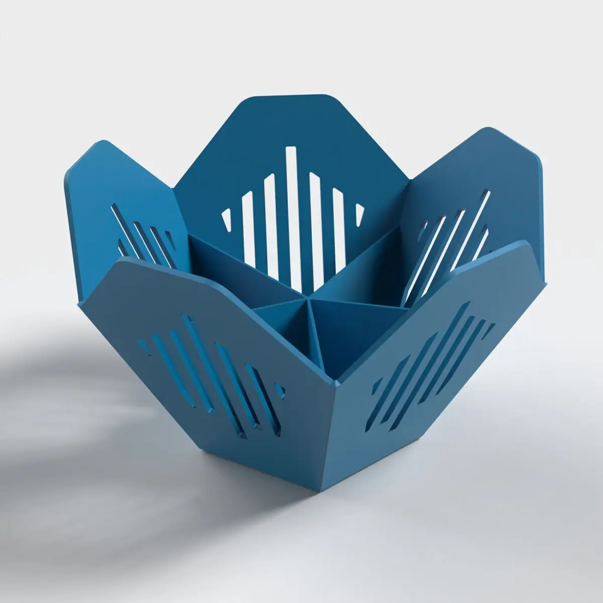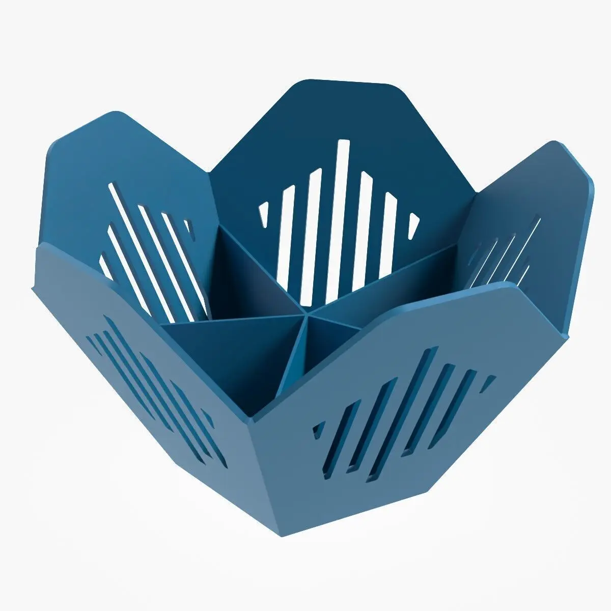 This desk organizer features a geometric, open design that is both aesthetically pleasing and functional. The angled panels with slits provide a unique style and practical storage separated into compartments, suitable for organizing pens, tools, or other desk essentials.