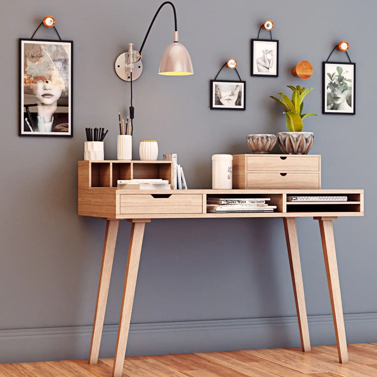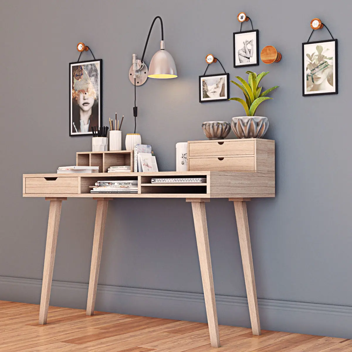 Desk with decorative set 3D model. Archive contains files Max 2014 , 2011 , obj , and all necessary textures.Set includes: 1. Desk2. Wall lamp3. Books4. Desk Accessories5. Vases6. Flower7. Pictures