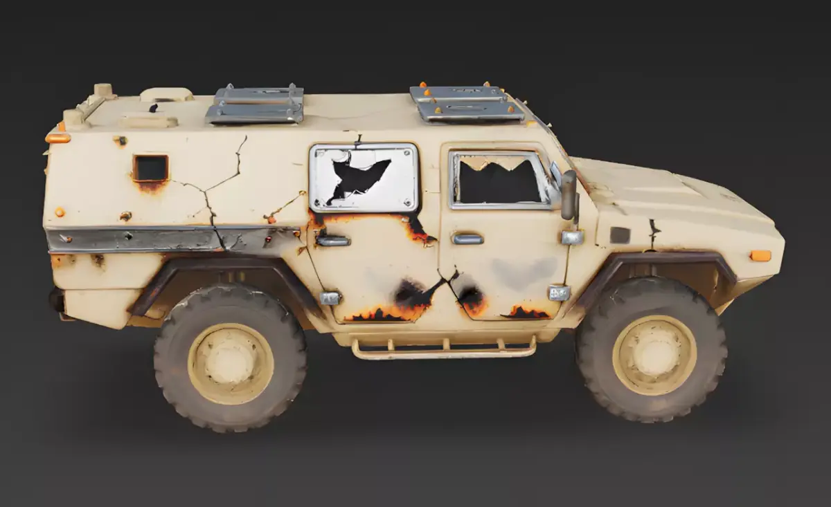 Asset BreakdownHere is a detailed breakdown of the design elements for this heavily damaged desert combat vehicle:
