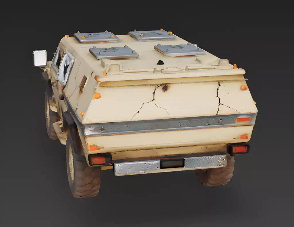 The Overall ConceptThis 3D model represents a heavy-duty desert Armored Personnel Carrier (APC) designed with a destroyed and abandoned aesthetic. It features a rugged, boxy fuselage and reinforced chassis, making it a perfect environmental prop for post-apocalyptic wasteland dioramas or desert combat game levels.