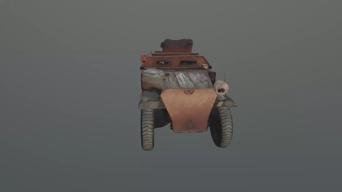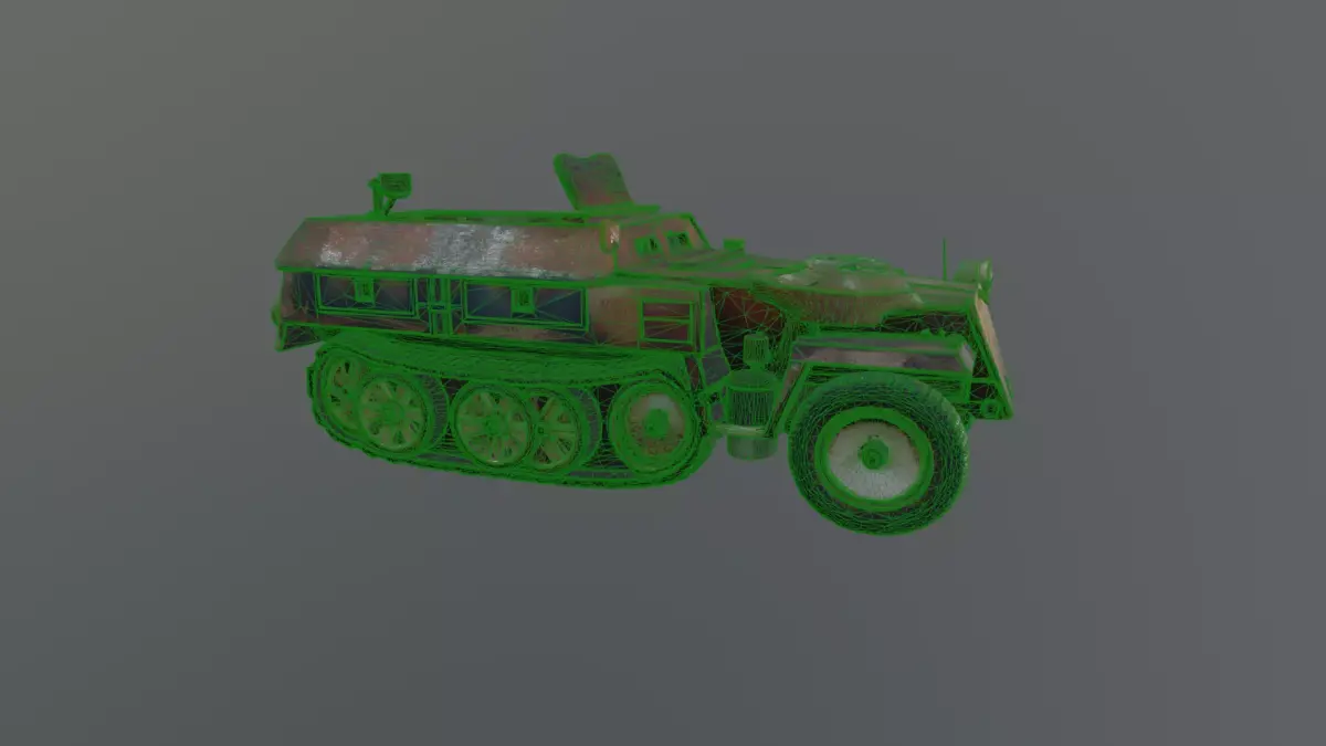 half-track armored vehicle inspired by mid-20th century military transport units. Features a front wheel steering system combined with rear tracked suspension, detailed cabin structure, rooftop hatch, and heavily weathered textures with rust, dirt, and worn paint. Optimized for real-time engines with efficient geometry, making it suitable for war scenes, post-war environments, military simulations, and strategy games