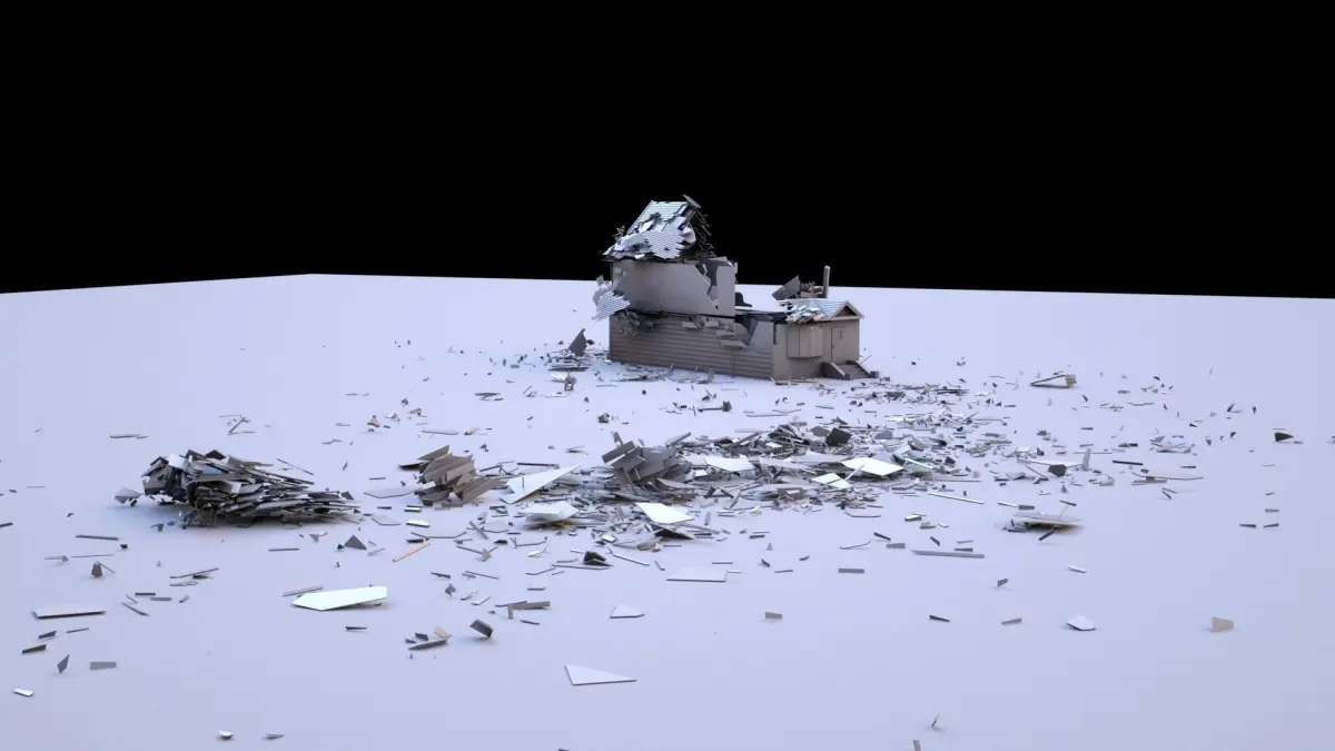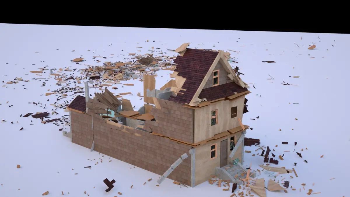 A destroyed high poly house model with 10 different layers (doors, floors, innerwalls, outerwalls, roof, rooftiles, stairs, wall planks, windows and window frames).