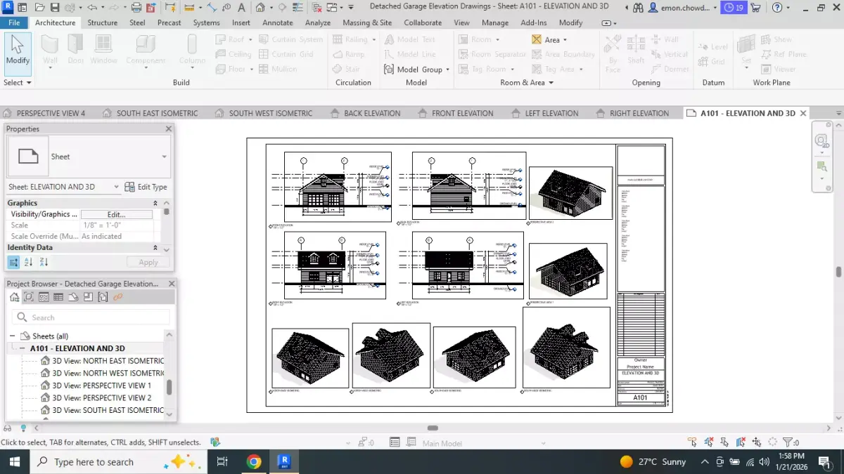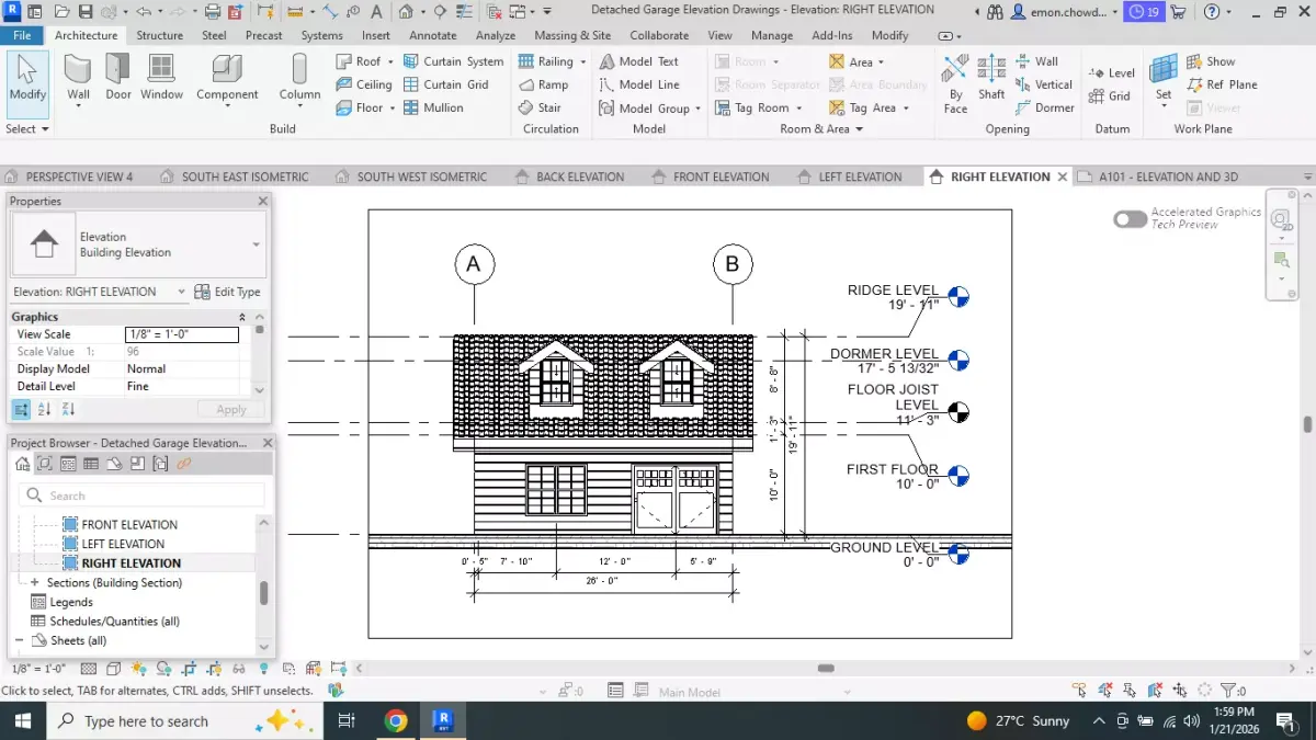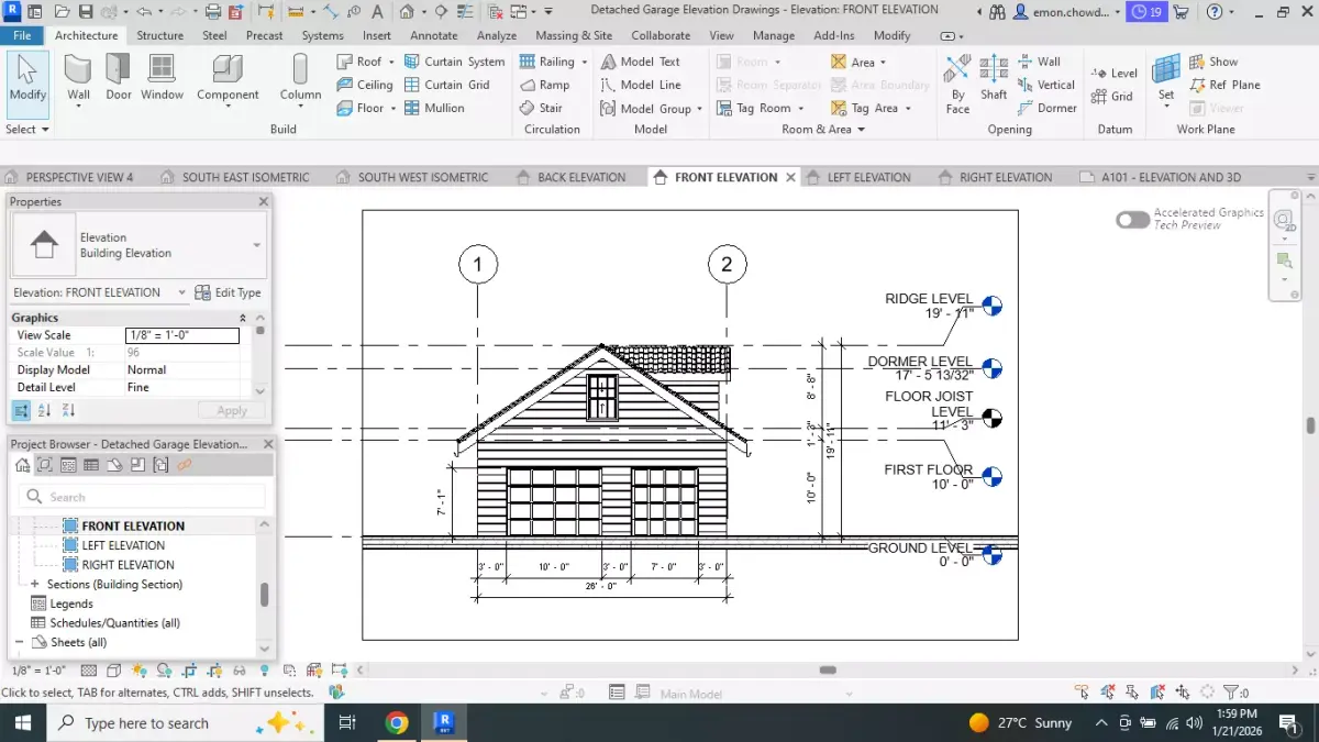 Software: Autodesk Revit 2026Model Type: Fully parametricFootprint: 26’ x 26’ Detached GarageUse Cases: Architectural design, BIM coordination, visualization, documentation