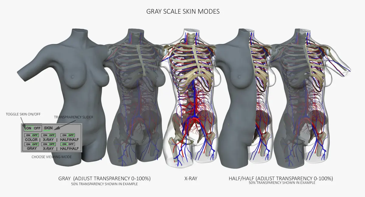 Includes 6 skin modes, skeletal system with connective tissue, muscular system, circulatory system, nervous system, lymphatic system, digestive system, respiratory system, and urogenital system.