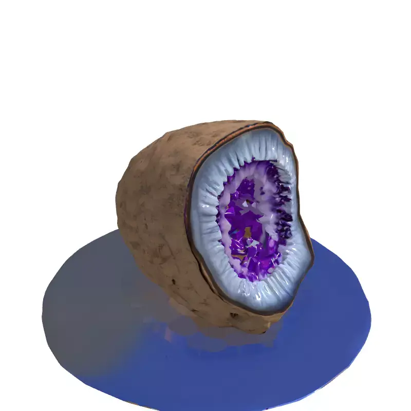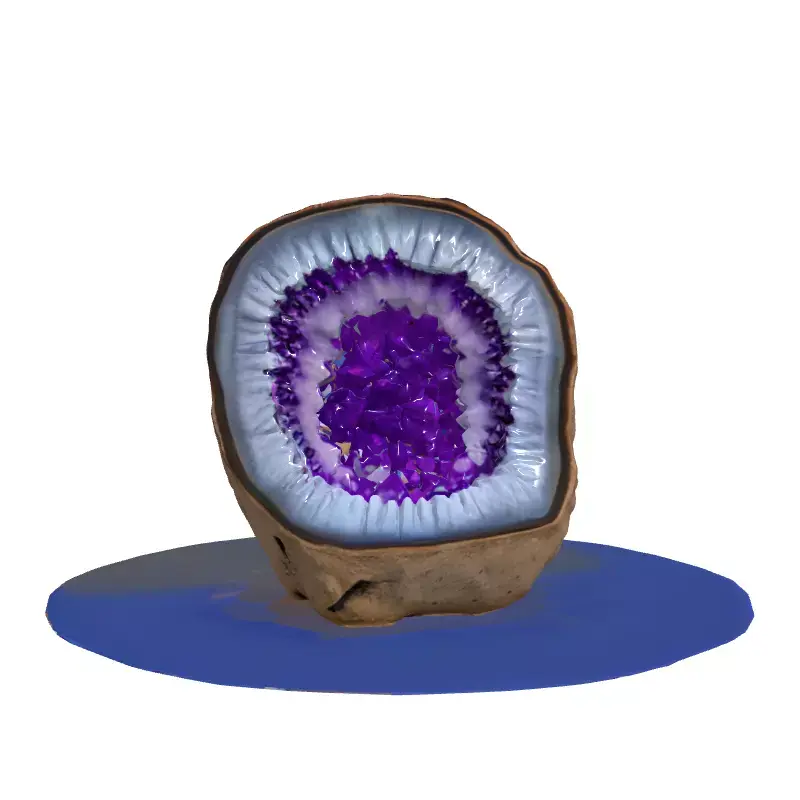 Presenting a meticulously crafted 3D model of a natural amethyst geode, cut to showcase its stunning crystalline interior. This highly detailed model accurately captures the rough, earthy texture of the geode's exterior, which seamlessly transitions into layers of lighter-hued quartz crystals before culminating in a dense cluster of brilliant, deep purple amethyst points. The natural variations in crystal size and density are faithfully recreated, offering a truly realistic representation. This versatile asset is perfect for a wide range of applications, including immersive game environments—such as fantasy ruins, magical caves, or alien landscapes—where it can serve as a captivating collectible or environmental prop. It is also ideally suited for architectural visualization projects, adding a touch of natural elegance and luxury to upscale interior designs. Furthermore, the model can enhance augmented reality (AR) experiences, digital art compositions, product rendering, or educational content focused on geology and mineralogy. Optimized for both real-time applications and high-fidelity static renders, the model features clean topology and is fully UV unwrapped for easy texture application. It supports industry-standard PBR (Physically Based Rendering) textures, ensuring photorealistic results across various rendering engines. The model is available in multiple common 3D formats, including GLB, OBJ, STL, FBX, and USD, providing maximum compatibility for your projects. Its high level of detail makes it suitable for close-up shots, while an optimized mesh ensures efficient performance in interactive environments.