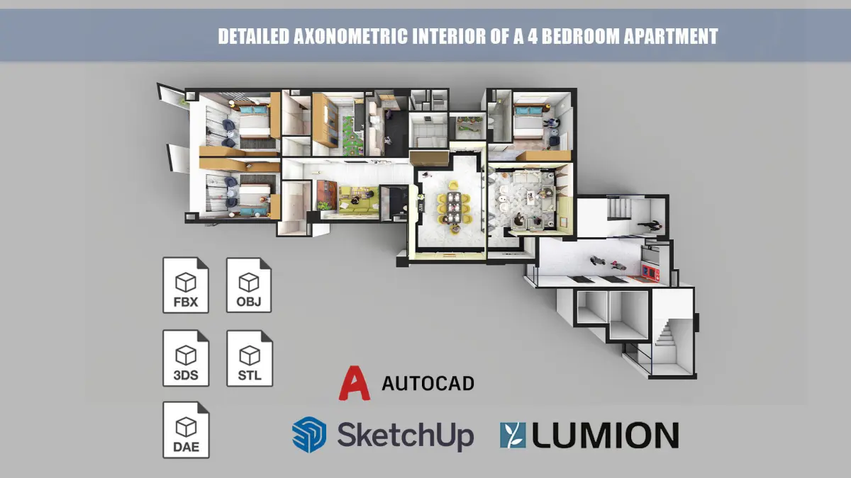 The living space leads to the guest bedroom with fully ensuite bathroom. The living room has a fancy dark themed powder room providing privacy to the cozy family living room from the dining space. Opposite to the family space is the kid's bedroom with a bunk bed for 2 kids. This bedroom is small, compact, multifunctional and playful. This apartment has two master bedrooms both identical and one of them links directly to the kids bedroom. The kids bedroom as two access points. Each of the 2 master bedrooms are equipped with terraces and fully ensuite bathrooms. This compact residential floor plan is highly detailed and multifunctional. It is a great learning tool for Interior design students and teachers. The model is well grouped and ideal for animations, games, advertisements and presentations.