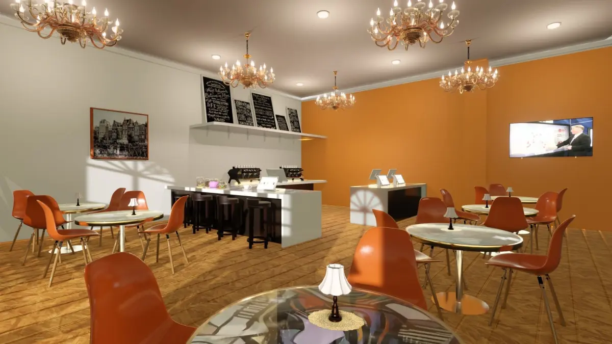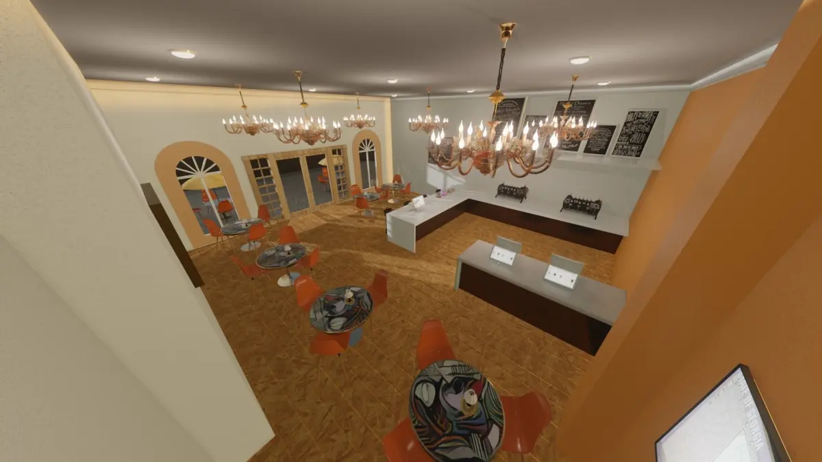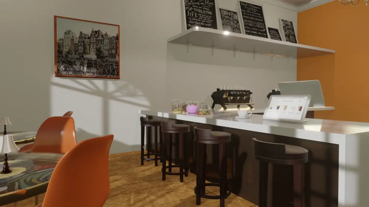 Step into a beautifully crafted 3D model of a detailed coffee shop designed in Blender. This model features an elegant blend of classic and contemporary design elements, perfect for architectural visualization, game development, virtual reality experiences, and more. The exterior boasts a welcoming entrance with large windows, inviting customers to peek inside. The interior is meticulously detailed with vibrant orange walls, stylish seating arrangements, and a modern counter area equipped with digital order screens.