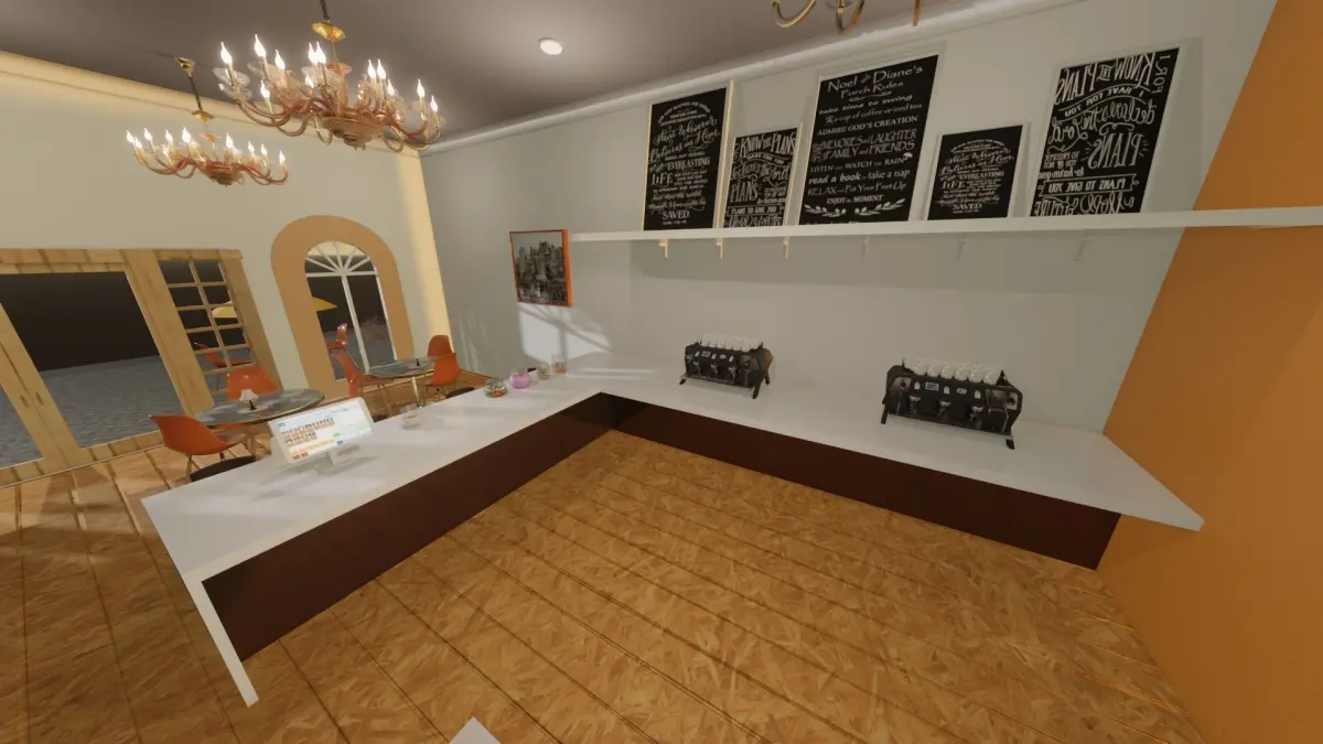 - Counter Area: Spacious counter with dual espresso machines, digital order screens, and a variety of décor elements.