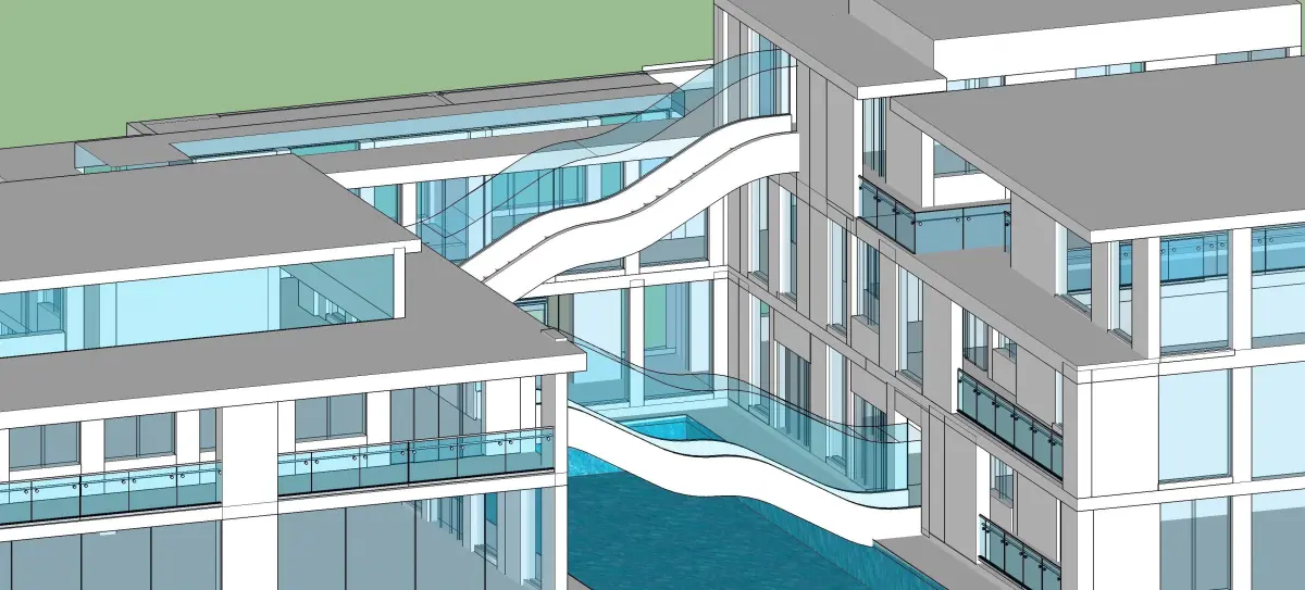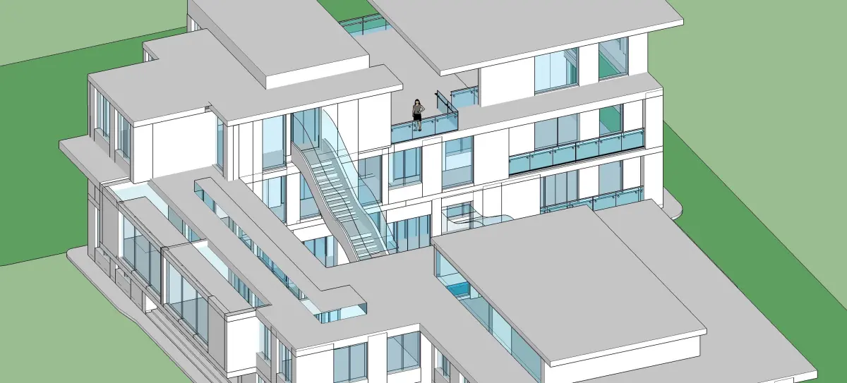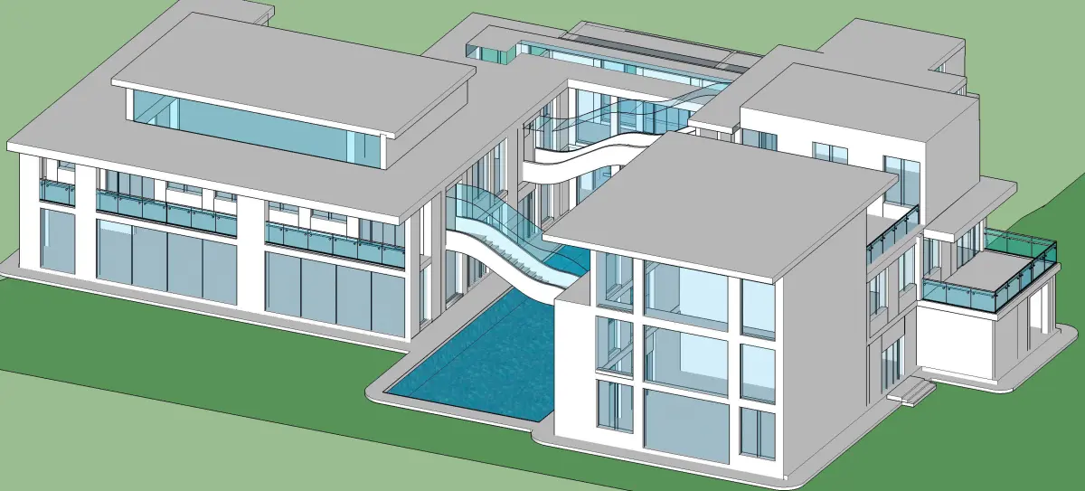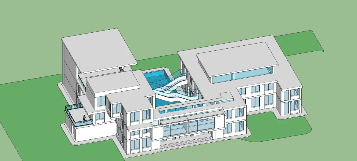 Detailed design of an office with water body and floating organic stairs