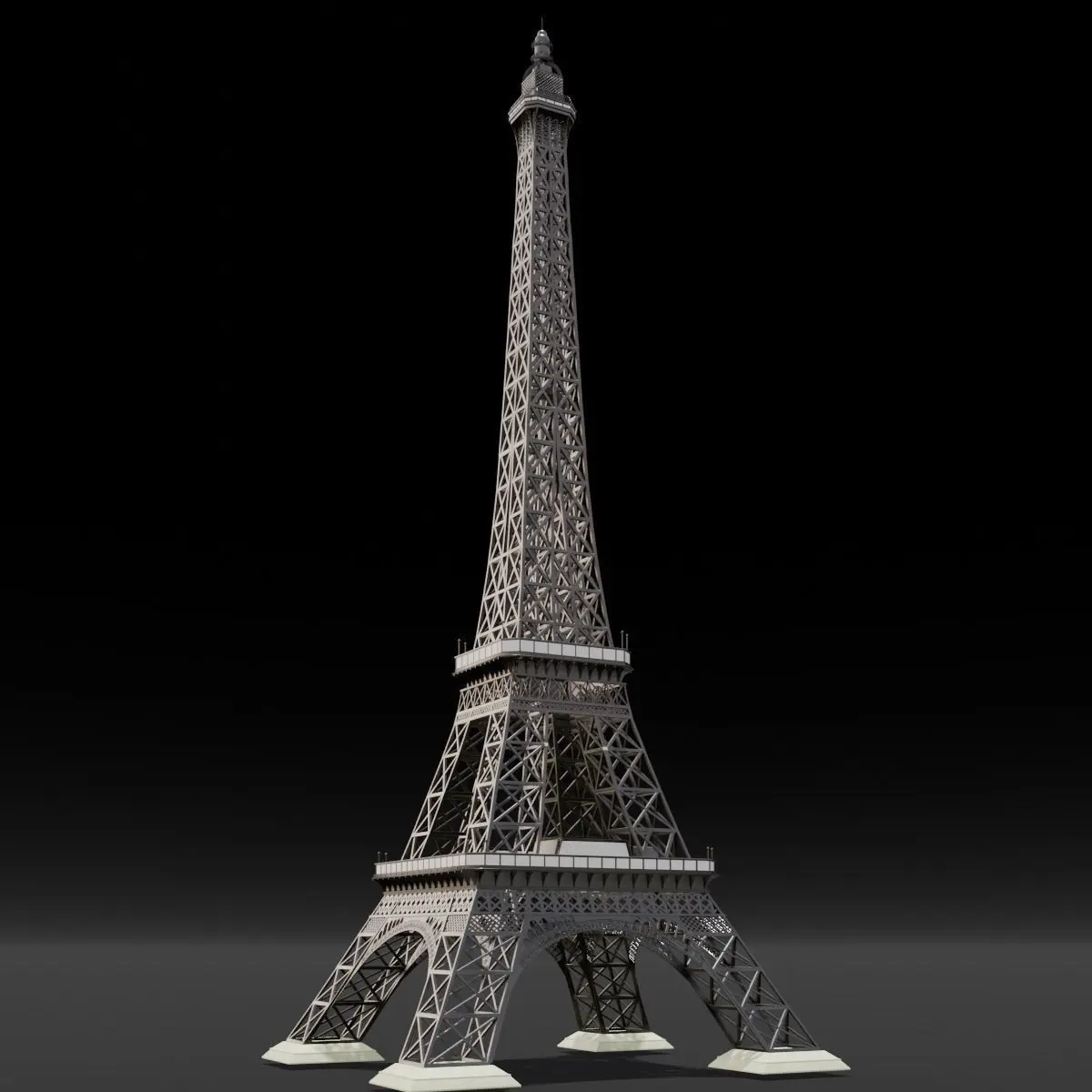Textures and Materials:Various materials have been thoughtfully applied to the model, enhancing its visual appeal and simulating the surface properties of the Eiffel Tower. While textures are not included, the strategic use of materials ensures an authentic portrayal of the tower's surface characteristics.