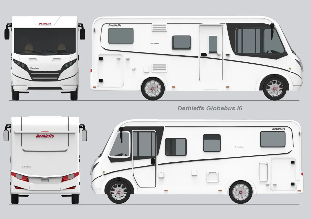 Dimension of the Dethleffs Globebus i6: Length - 6.95 m / Width - 2.20m / Height - 2.81m