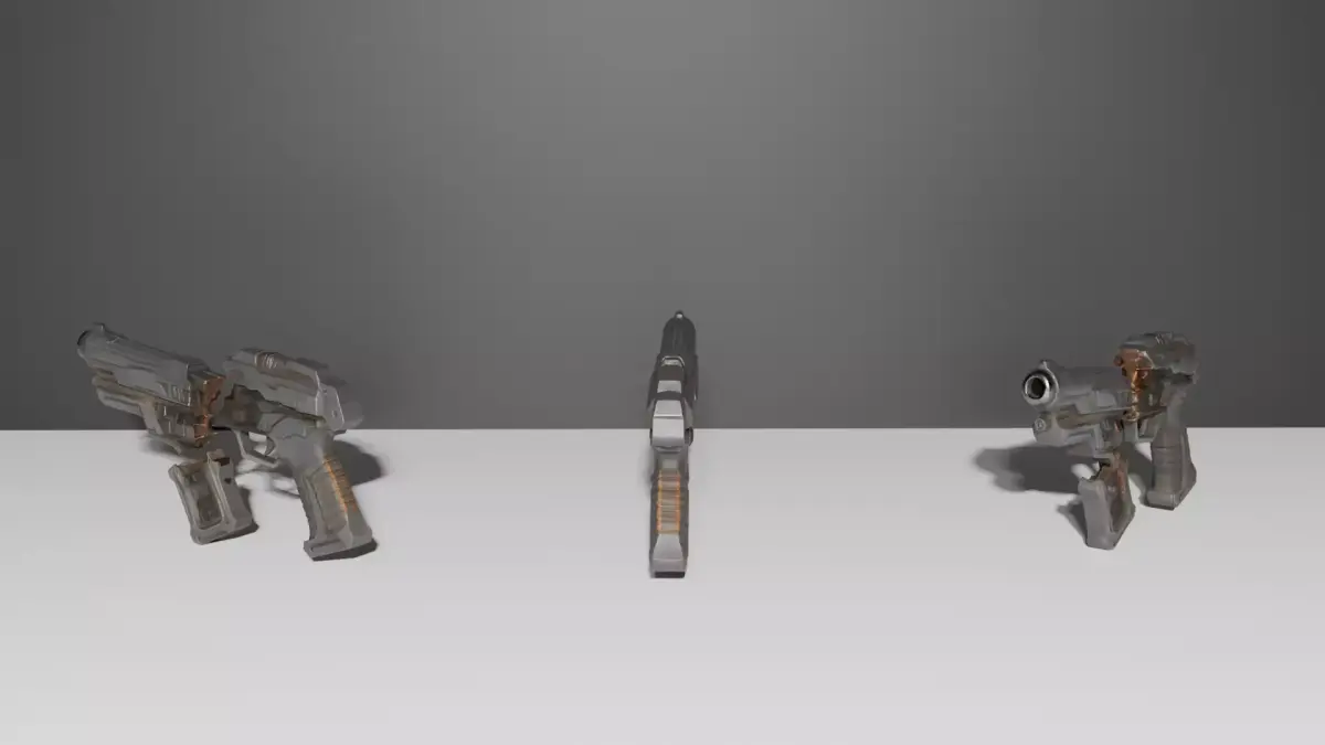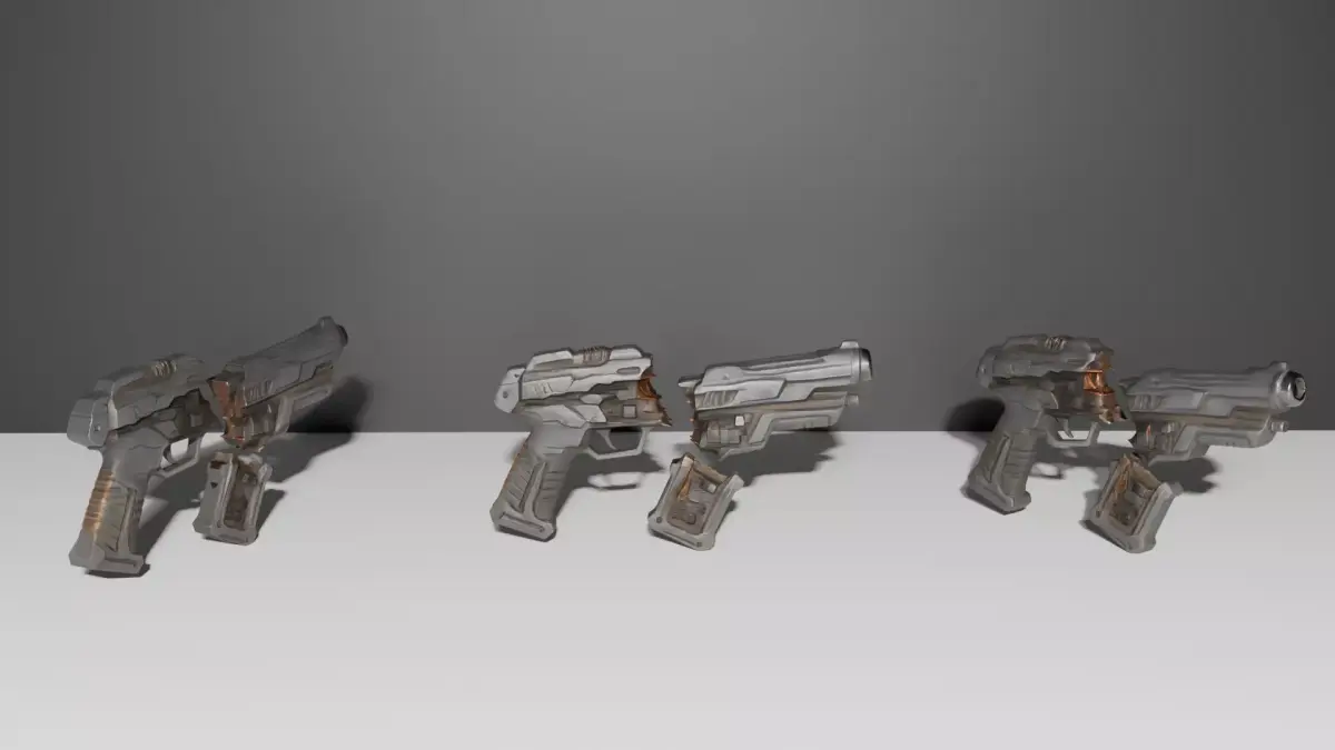 This 3D model represents a blaster gun broken in half, suitable for games, advertising, film, and VFX.